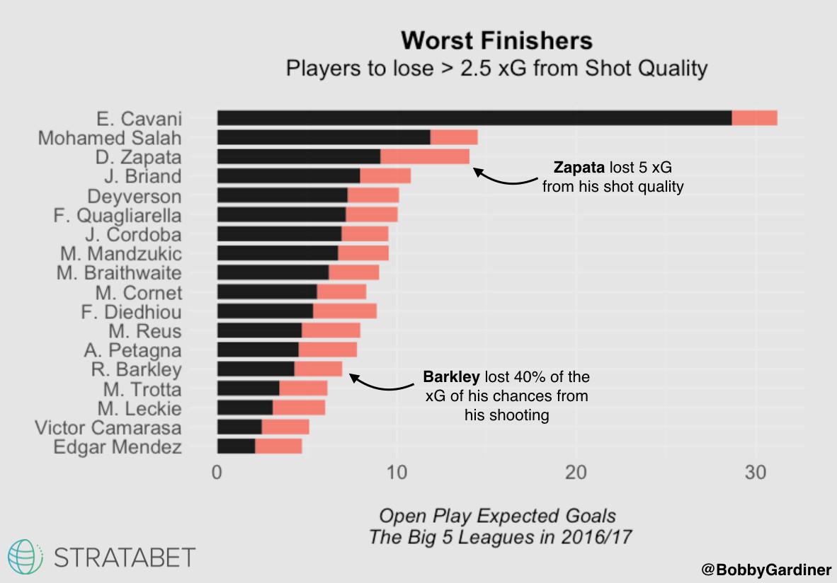 For some of the players with fewer chances overall, the quality of their shots may have defined their seasons. Federico Bernardeschi was signed from Fiorentina by Juventus for €40 million in the summer, as he scored seven open-play goals rather than the three implied by a chance quality model because of his finishing. But for players like Cavani, who lost three xG from the quality of his shots but nonetheless scored 27 open-play goals, the chances themselves are far more important.
