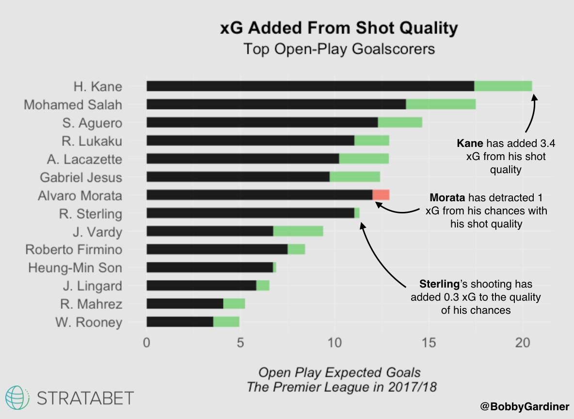 Álvaro Morata, widely derided for his finishing against Arsenal in Chelsea’s first match of 2018, is the only player to score more than six open-play goals in the Premier League while also detracting from the quality of their chances with their shooting. Mohamed Salah, meanwhile, who has been similarly accused of missing chances, has added 3.7 xG from his shot quality this season. Both cases illuminate the streakiness of finishing for most players. While they scored an identical 15 open-play goals last season, Salah lost 18 percent of the xG of his chances at Roma through his shot quality, while Morata added 23 percent.