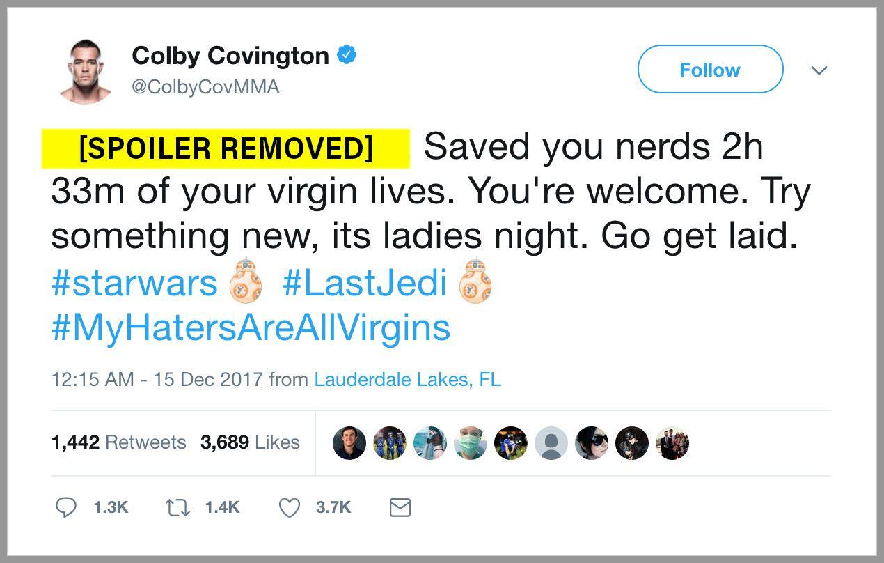 The actual honor goes to welterweight contender Colby Covington, though, who not only trolls current champion Tyron Woodley almost daily on his Twitter feed — who not only trolled the entire country of Brazil by (racistly) calling them “filthy animals” when he was there to fight Demian Maia — but who pinned a Star Wars: The Last Jedi spoiler on his Twitter feed like the Biggest Dick Ever Conceived. People who already disliked him for being a poor man’s Chael Sonnen became downright livid at his inconsideration. To some fans, you can say what you want about people in other countries, but ruin Star Wars? That’s a step too far.