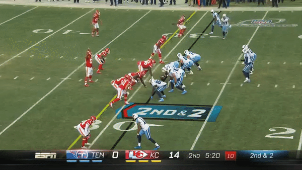 Pro Football Focus charted Mariota as going 16-of-19 for 188 yards on throws to the middle of the field against the Chiefs. That’s typically where he’s been the most effective, and his knack for exploiting the area between the numbers only improves when the Titans use play-action. Look at this throw from late in the second quarter. With the play fake influencing the Chiefs linebackers, Mariota has a ton of space into which he can fit a ball to tight end Delanie Walker. Mariota averaged 5.5 more yards per passing attempt this season with play-action than without, the highest mark in the league, according to Pro Football Focus. His 122.8 passer rating with play-action was the best in the league.