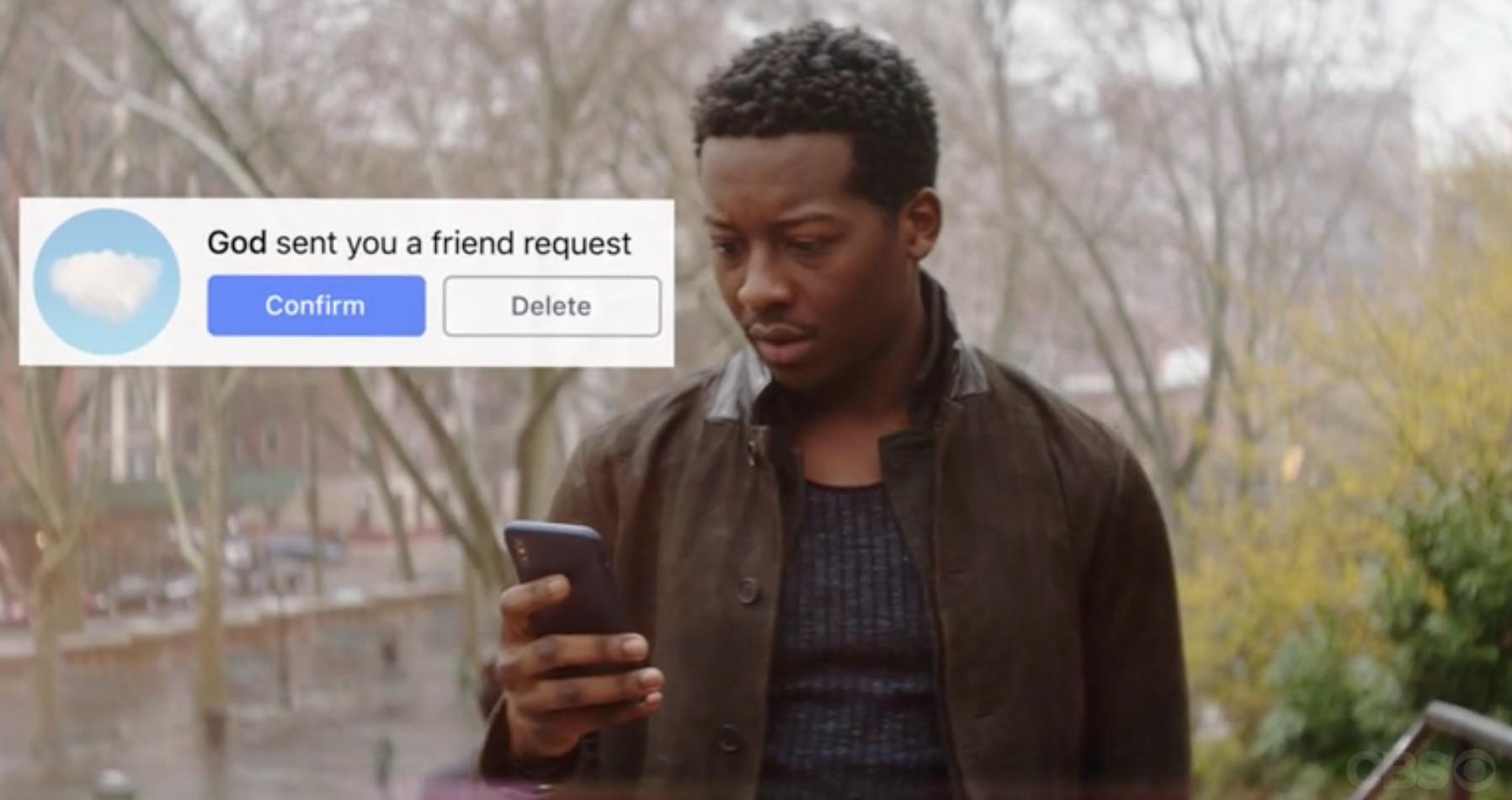 The new CBS series God Friended Me, which premiered Sunday night, is asking heady questions about whether God still has a grand design in 2018, and how the divine creator can reach his flock when people are feeling more alienated than ever. The show is incredibly earnest, at a time when most TV dramas are (sometimes literally) quite dark. That’s commendable in and of itself. But it’s difficult not to resort to mockery when the show is called GOD FRIENDED ME, and when this happens within the first five minutes: