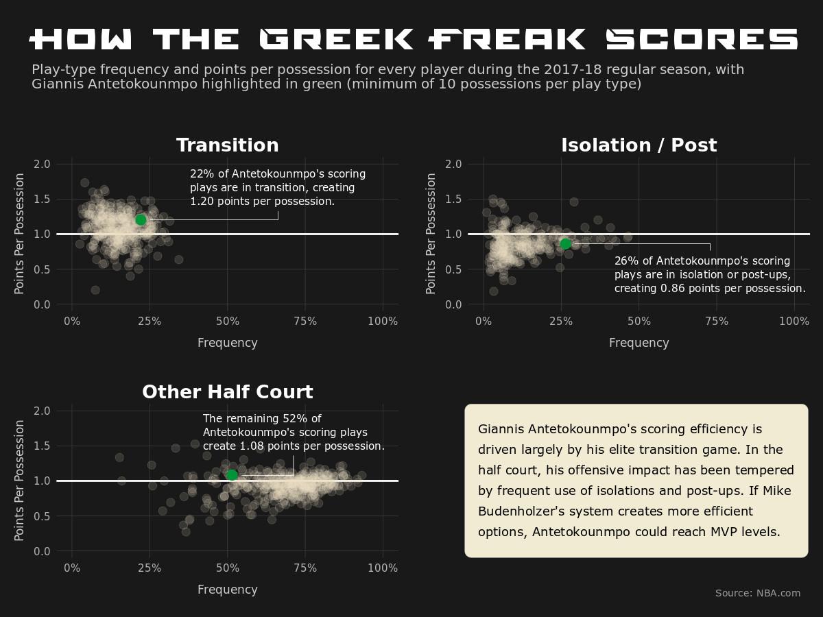 Jonathan Tjarks: Giannis is already one of the best offensive players in the NBA. The next step is translating his incredible physical tools to defense so that Bucks head coach Mike Budenholzer feels comfortable playing him at the 5 in small-ball lineups. Giannis has the size, length, and quickness to protect the rim, switch screens, and stay in front of elite perimeter players. If those lineups hold up on defense, they will be impossible to slow down on offense.