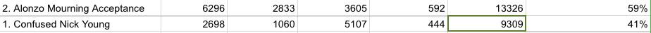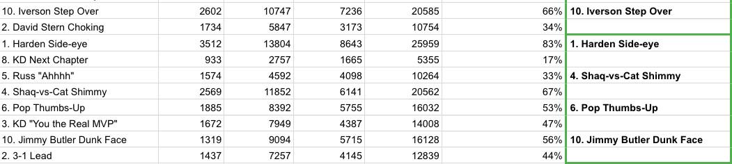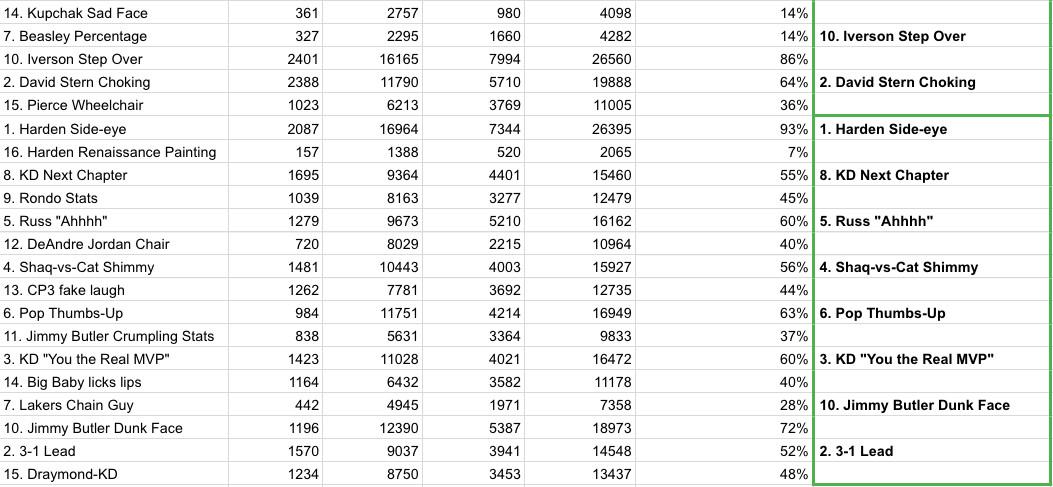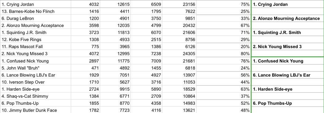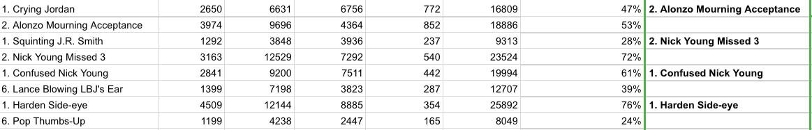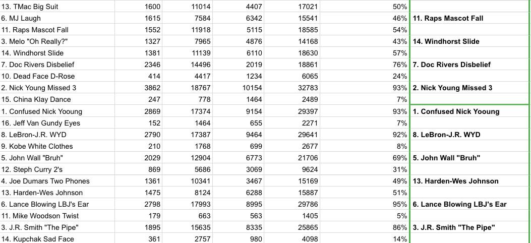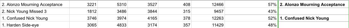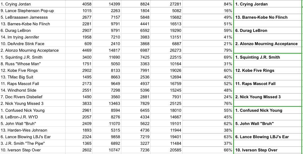 The votes from the outer counties, across all platforms of the internet, have been tabulated with care. Your winner, by direct democratic vote, is Alonzo Mourning Acceptance over Confused Nick Young, 59 percent to 41 percent. For the public good, and to allay any fear of manipulation, the accumulated totals for all rounds are posted here.