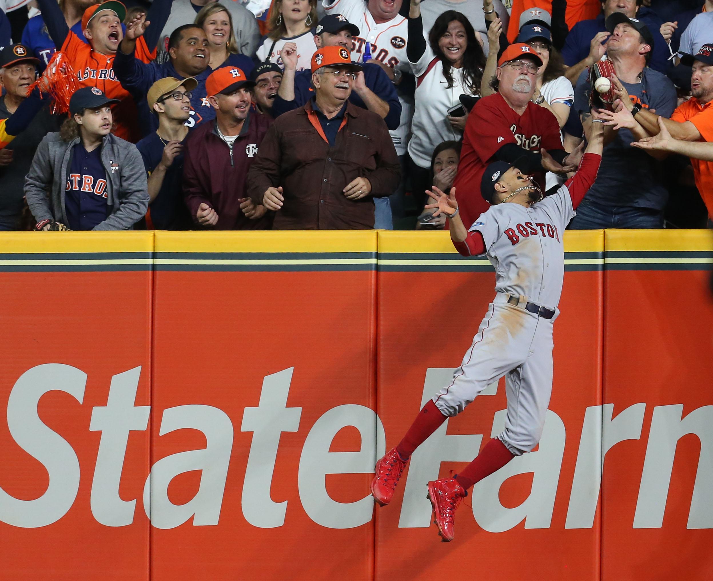 Down 2-0 in the bottom of the first, José Altuve, who’s DHing through a knee injury that makes him run like a scale model of Kirk Gibson, hit what looked like a game-tying home run. Red Sox outfielder Mookie Betts leapt up against the short right-field wall to try to grab the ball, but his glove bounced around among some fans in the first row and the ball went over the fence.