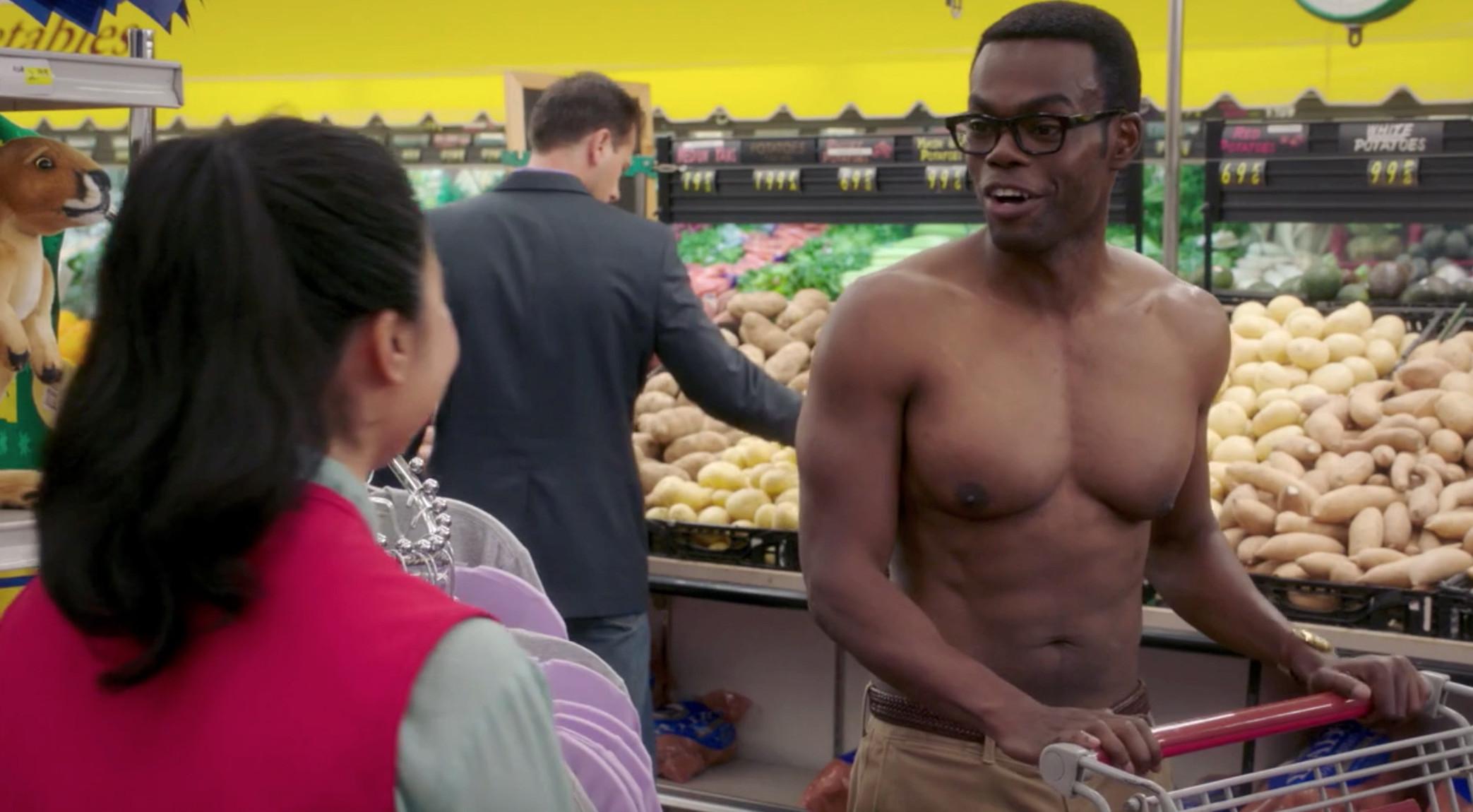 Which brings us to our Worst Person of the Week, who is, shockingly, our resident philosopher, Chidi. Everyone in the group handles Michael’s horrific news differently: Eleanor spends the day copping free drinks at a bar by lying about her birthday—not great, but she does do the right thing and return someone’s missing wallet instead of stealing it; Jason and Tahani start giving away money on the streets of Sydney. But Chidi just turns into a pit of despair. He walks straight into some sprinklers after quoting Nietzsche (“God is dead”) to a pot dealer. He cooks a giant pot of chili and fills it with Peeps and M&Ms [vomits]. He takes off his shirt. (A quick note: Eleanor was right when she said that Chidi was an oddly ripped dude. He might be the most indecisive person in the world, but damned if he hasn’t been committed to biweekly bicep curls.)
