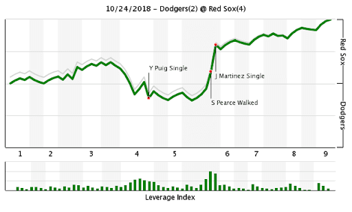 But I’ve got an even better idea: What if the Dodgers just got Christian Vázquez out when he was down to the last strike of the inning? Failing that, the Dodgers had four more chances to get one out and escape the fifth inning with at least a tie. Betts, Benintendi, Pearce, and Martinez are far superior hitters to Vázquez, but every single one of them is more likely than not to make an out in a given plate appearance. The Dodgers needed that to happen once in five plate appearances to avoid the fate that befell them in Game 2, and they couldn’t get it done.