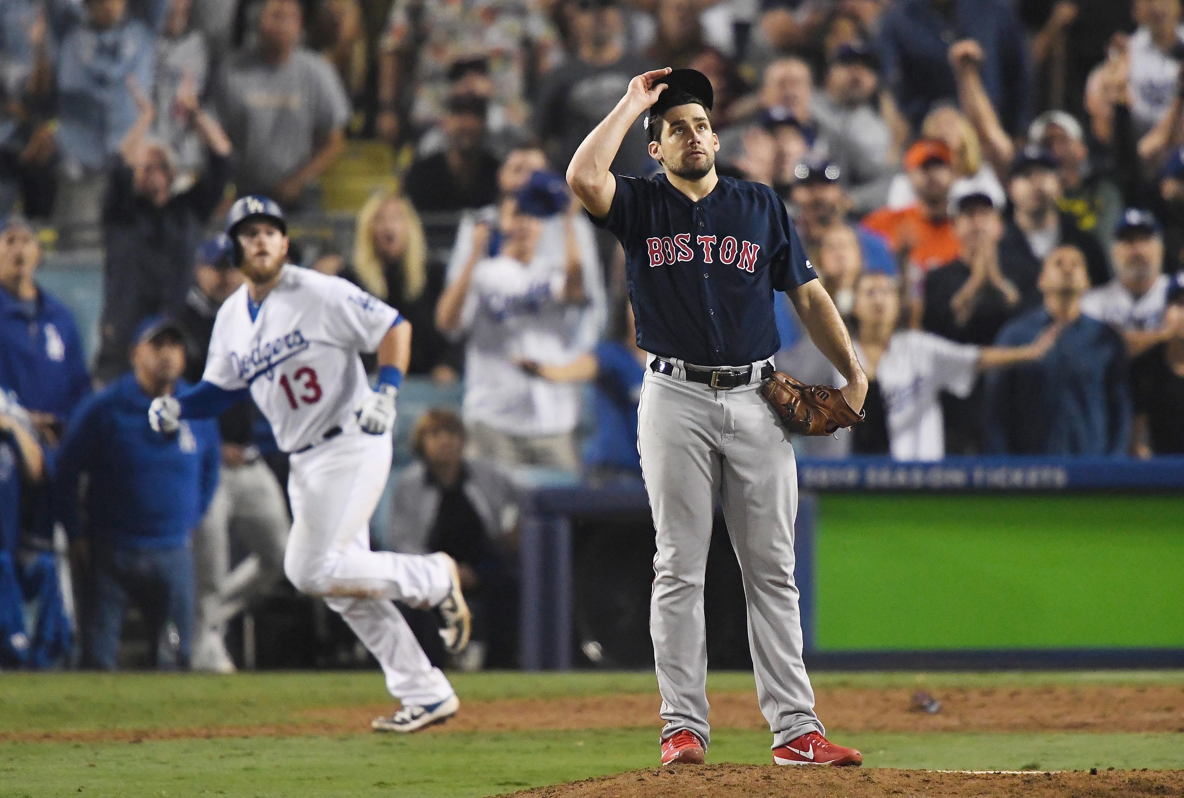 Eovaldi entered the game in the 12th inning as the 23rd Red Sox player to see action, tying a World Series record. Likely he expected to see just an inning or two of play, three at the most—no World Series game had ever lasted more than 14 innings before. So Eovaldi came out throwing smoke, hitting triple digits with his fastball early on, and the Red Sox took the lead in the top of the 13th. Eovaldi walked Muncy to lead off the bottom of the inning, then retired the next two batters and arranged for Yasiel Puig to hit a hard ground ball to Red Sox second baseman Ian Kinsler.