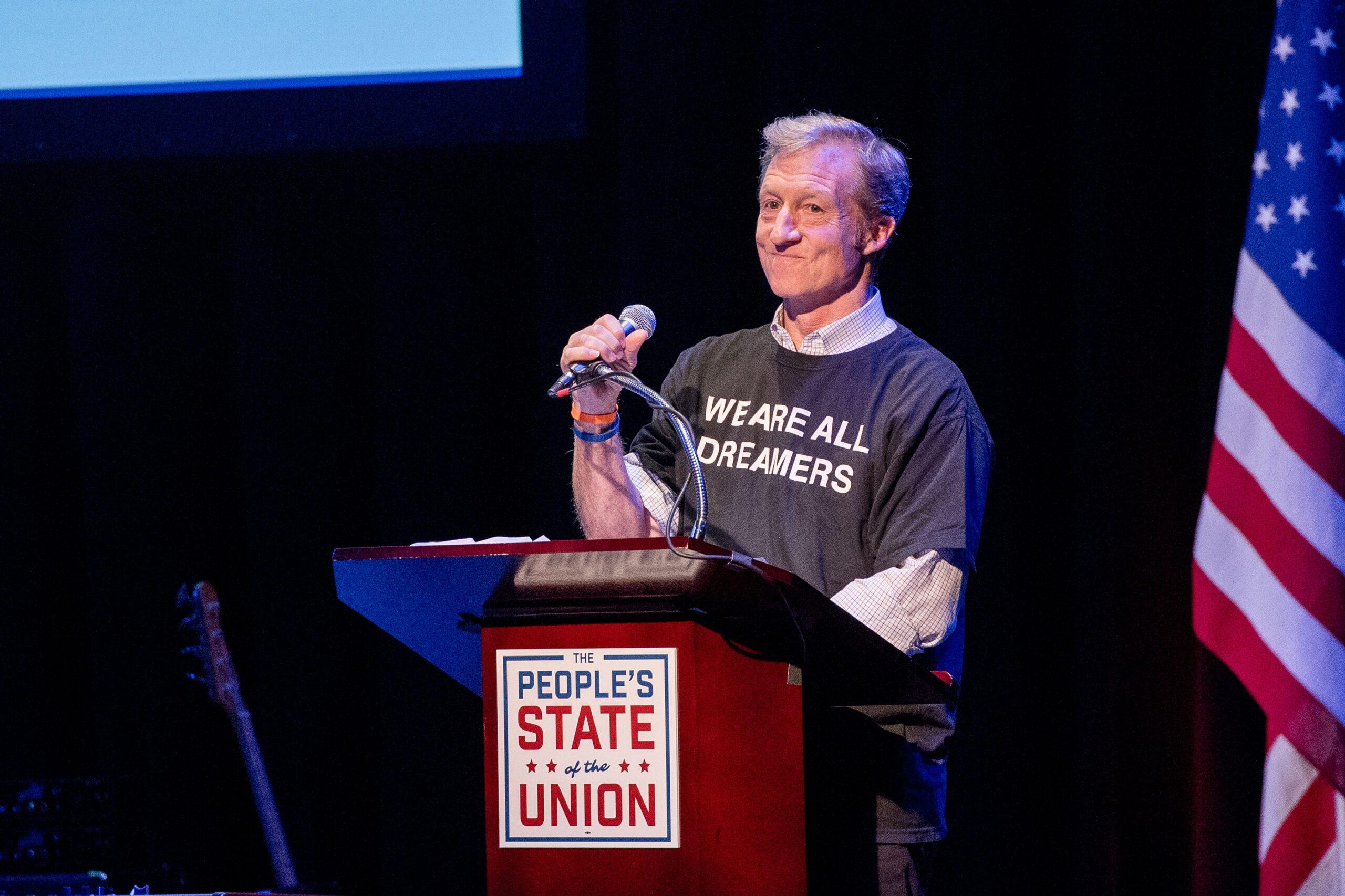 It has the feeling of a campaign rally, and maybe one day these sorts of appearances will be. Sometimes it’s difficult to imagine Steyer making true headway as a national candidate; he’s unpolished and can be dry; he’s a California billionaire who used to profit from fossil fuels; he’s that guy from the impeachment commercials and is currently not exactly a beloved figure by many Democrats as a result. “My attitude,” Steyer tells me at the Renaissance hotel earlier that day, “is I’m trying to do something I deeply believe in, and I’m aware that it’s going to threaten the interests of powerful, nasty people. And they’re going to respond in powerful and nasty ways. It’s like Australian rules football. If you walk by, and you give them a chance, they’re going to elbow you in the nose.”