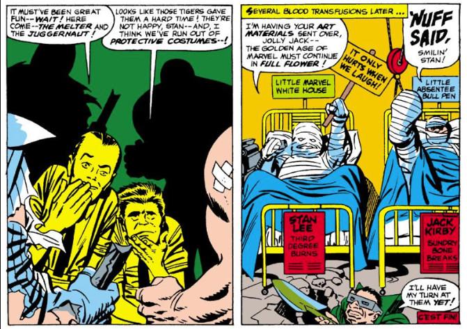 Marvel’s house style—the chatty, everyday banter mixed with saving the world—is the DNA of the Marvel Cinematic Universe. The Avengers’ shawarma credits stinger is a callback to the early work presided over by Lee and his various collaborators; same for the scene in Iron Man when Tony Stark directs Pepper Potts on how to change out his chest reactor or the Thor-Hulk argument in Thor: Ragnarok; and many, many others.