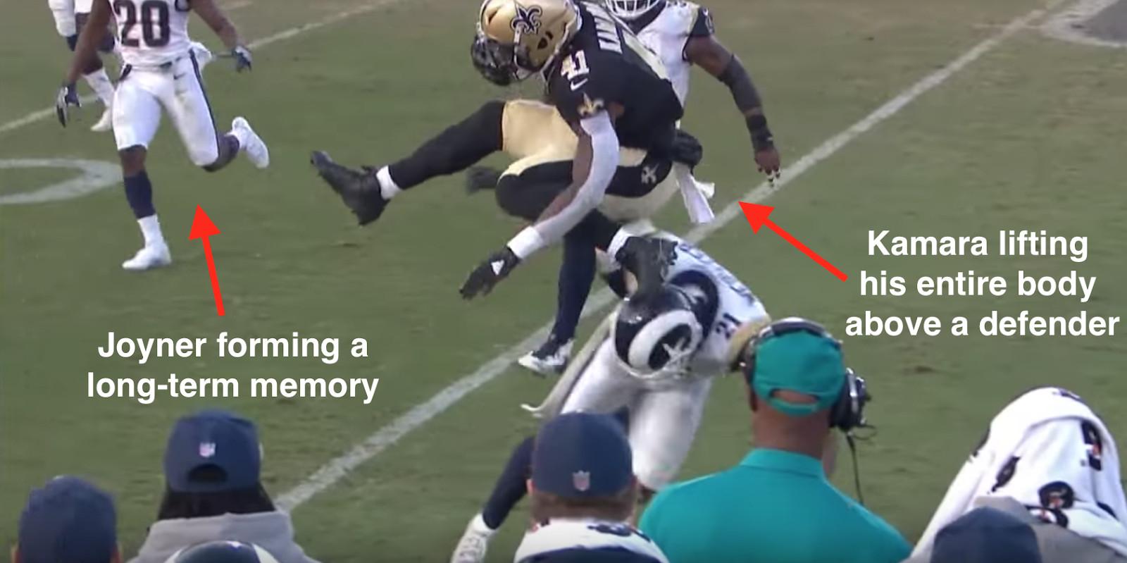 Joyner’s déjà vu likely ran even deeper than just the Gordon incident in Week 3. During last year’s Saints-Rams game, on a play that also happened at midfield in the fourth quarter, Joyner watched Kamara hurdle another Rams defender.