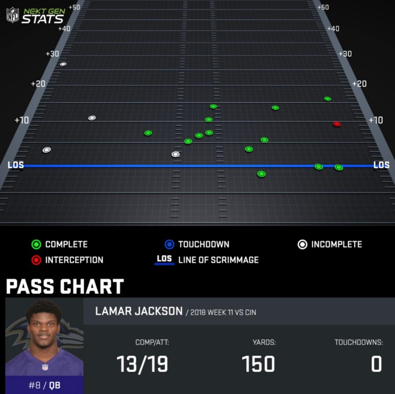 In the dropback passing game, Baltimore relied on a lot of quick-developing hitch and slant routes over the middle. The game plan was clearly designed to help ease Jackson in as a passer, giving him plenty of first-read throws over the middle and quick screens to the outside. His passing chart from Next Gen Stats shows how the air attack helped balance what he was doing with his legs to the outside.