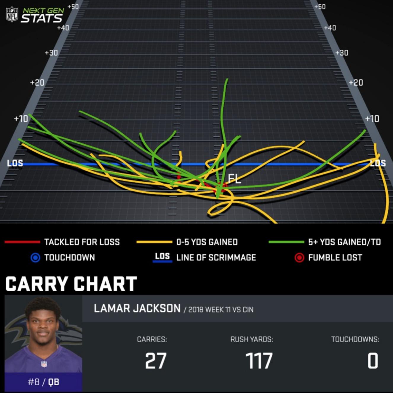 Jackson’s run chart from NFL Next Gen Stats illustrates how he used his legs to attack the edges of Cincinnati’s defense.