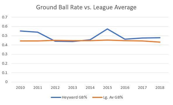It also bears repeating that ground balls aren’t necessarily bad—Christian Yelich had the ninth-highest ground ball to fly ball ratio among qualified hitters this year, and he won the NL MVP because when he hit the ball on the ground, he hit it really hard. Statcast-based metrics—exit velocity, barrels, xwOBA, and so on—don’t date back to Heyward’s rookie season, but FanGraphs does have numbers on contact quality for Heyward’s entire career, based on data from Baseball Info Solutions.
