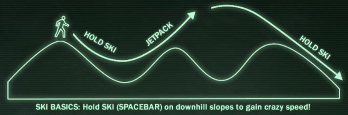 Moore wouldn’t divulge what the bug was. Instead, he brought Youngblood back to his office and told him how to trigger it. “It was, ‘OK, you’re on top of this hill. Run toward the next hill, and when you get to the top, jump and then just keep jumping as you go all the way down,’” Youngblood says. “And I played with it and was like, ‘Holy crap.’” Pressing the jump button canceled the collision with the landscape, allowing the player to accelerate down slopes and frictionlessly launch into the air, attaining much higher speeds than were possible with the jet pack alone. “[It] was ‘wrong,’ but it actually made the game more fun to play,” Youngblood says. “I looked at him and was like, ‘Nope, don’t fix it. This is now a feature.’”