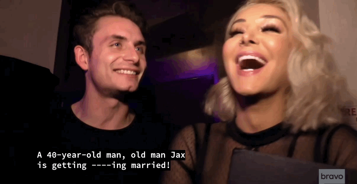 Things are looking pretty good for Jax. Last episode, we saw him propose to Brittany, a woman who should scorn him but instead loves and supports him. He bought a big ring, he pulled off a sweet proposal, and then, in Episode 2, he whisks her away to a surprise engagement party with all their friends. It is, dare I say .... nice! Then, at said surprise party, he slips just a bit, admitting he still has to make it through the bachelor party before getting to the wedding.