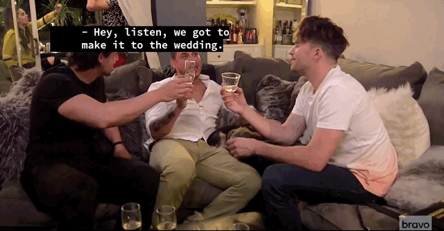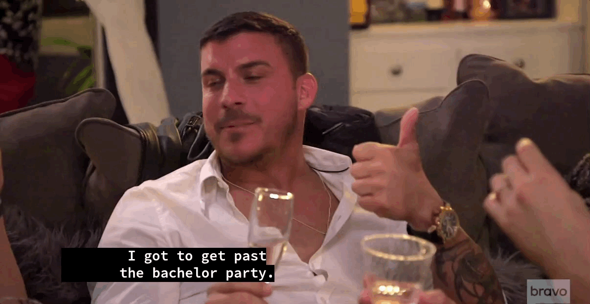 He makes this admission to friends Peter and Tom, the latter of whom had a remarkably difficult time “getting through” his own engagement without incident. (He cheated on his wife.) Jax may as well have a giant “proceed with caution” sign glued to his forehead.