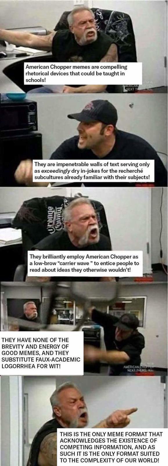 Danny Heifetz: I had a friend who studied memes in college. Yes, really. Higher education has already entered a brave new world. Anyway, he told me that memes were just the 21st-century version of comic strips. I didn’t really understand what he meant until I saw, and fell in love with, the American Chopper meme.