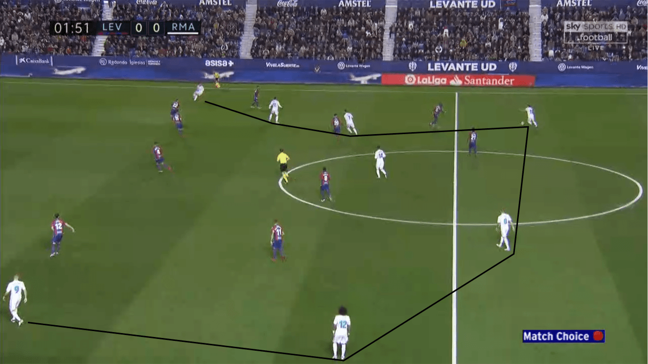 This season, Madrid have seen an increasing number of opponents abandon man-marking, and it’s exposed their limitations in build-up play. Fewer defenders still take the bite and follow Kroos or Modric while leaving central zones unmarked. They instead remain compact in narrow shapes and willingly give up space on the fringes of the field. It is a defensive approach every top-tier team has to deal with—be it Barcelona, Manchester City, Bayern Munich, or Real Madrid. But it’s not just that Zidane has not found the right answer; he has not even acknowledged the question. Despite the new approach from his opponents, he still lets his creative midfielders run the same plays over and over again. Kroos has the tendency to drop back into the left half-space (the zone between left back Marcelo and defensive midfielder Casemiro) if he does not feel comfortable with what he sees in front of him. Modric has shown similar tendencies, as the Croatian playmaker often moves into the right half-space. It ultimately creates a U-shape when Madrid are building up from the back.