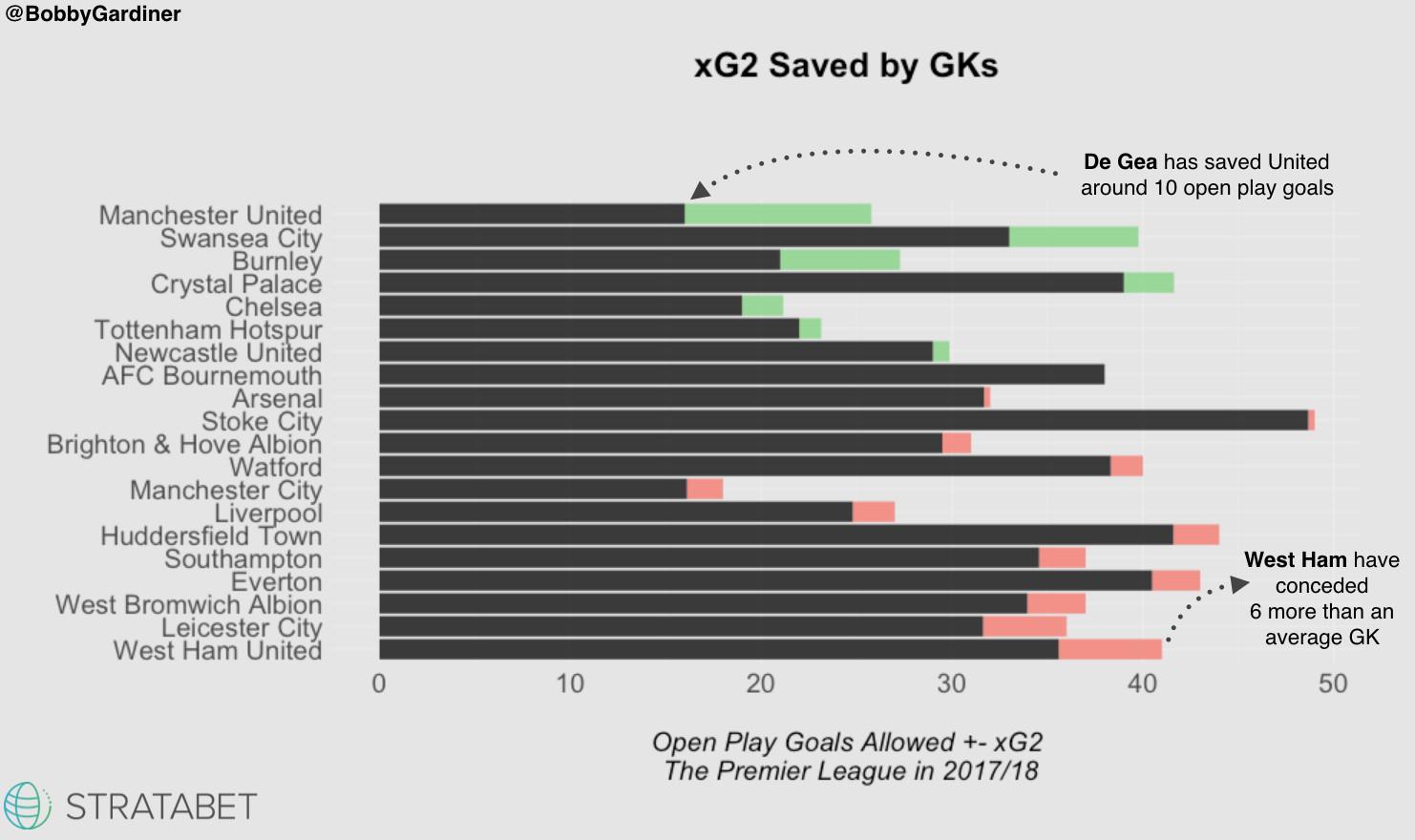 For my last piece for The Ringer, I created a second xG model (xG2) that included the quality of the shot taken in addition to the quality of the chance itself. If a player gets a good chance but misses the target, it will get 0 xG2. If he puts it into the top corner with pace, it might get 0.8 or higher depending on the situation. In that context, it was used from the point of view of the shooter, but it can easily be inverted to assess the impact of a goalkeeper. If a team is conceding fewer open-play shots on target than the shot quality model expects, their goalkeeper is saving shots that otherwise might have gone in. As it turns out, United have been relying heavily on their Spanish savior. They have conceded 10 fewer open-play goals than the shot-quality model would expect, given the shots on target that de Gea has faced.