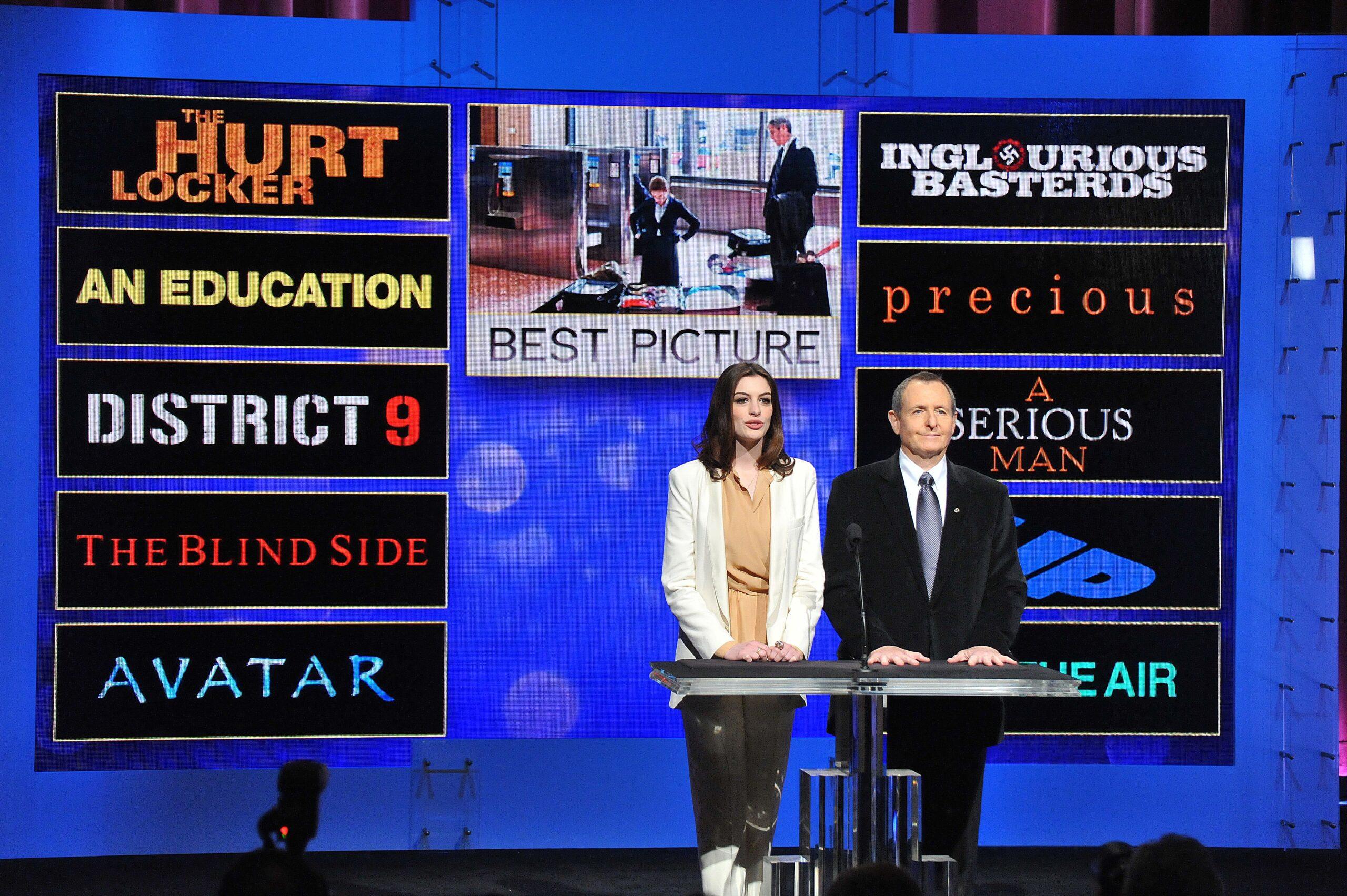 This has been more true than the Academy likely bargained for. In its first year in action, Cameron returned to the Best Picture race, once again toting the most successful box office performer ever, this time Avatar. Cameron was a slight favorite in an awkward face-off with his ex-wife, Kathryn Bigelow, and her film The Hurt Locker. The first 10 nominees represented a diverse collection that featured powerhouse auteurs (Inglourious Basterds), international sci-fi upstarts (District 9), a Pixar movie (Up, just the second animated movie to receive the honor), two Oscar-friendly character studies with movie-star turns (The Blind Side and Up in the Air), admired art-house films (An Education and A Serious Man), and, for the first time in history, a film directed by a person of color (Lee Daniels’s Precious: Based on the Novel “Push” by Sapphire). Two films directed by women were nominated, the only time this has ever happened. And Avatar’s blue-complected $600 million tally was seated right up front. This was Ganis’s dream, as perfect a group of nominees as he could have imagined. (Notably, 2009 is the last time that a comic book movie did not appear among the top-10 grossing movies of the year.)