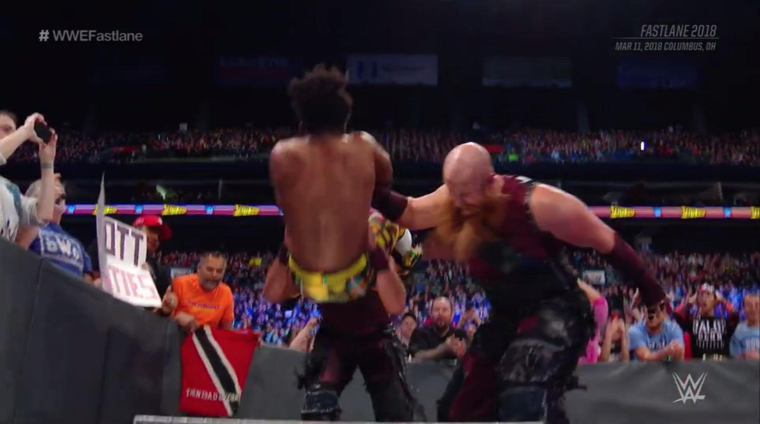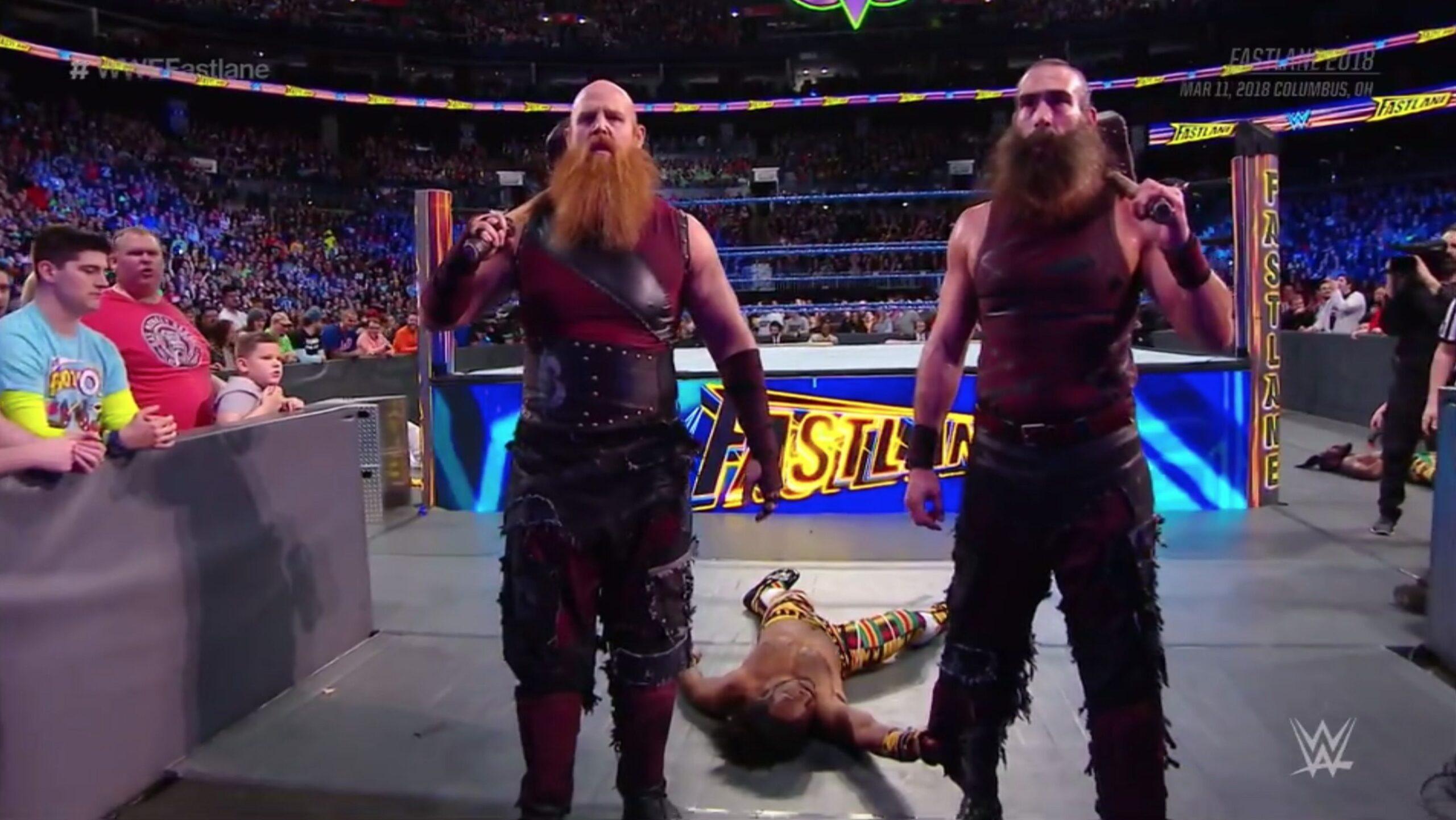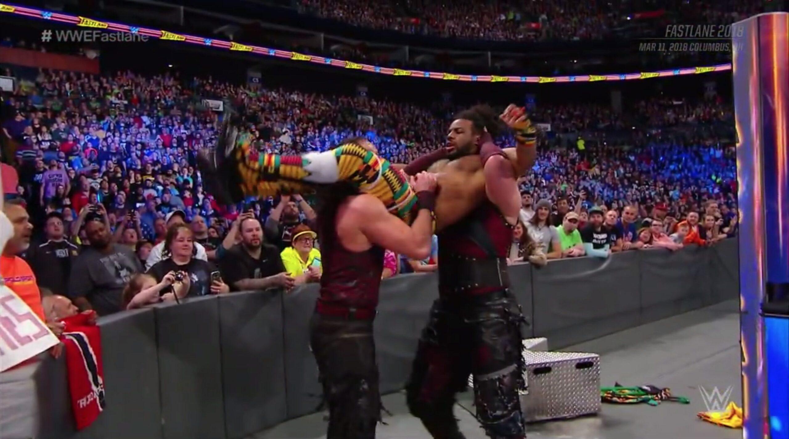 After all that buildup, the concluding chapter in New Day and the Usos’ grudgingly respectful rivalry turned out to be a glorified showcase for the Bludgeon Brothers’ WrestleMania push. On Sunday, in the midst of Fastlane’s tag-title tussle — featuring New Day’s Kofi Kingston and Xavier Woods vying for Jimmy and Jey Uso’s belts — Luke Harper and Erick Rowan ran interference on the lot of them, prompting a no-contest and culminating in a vicious powerbomb thudding Woods atop the ringside steel stairs.
