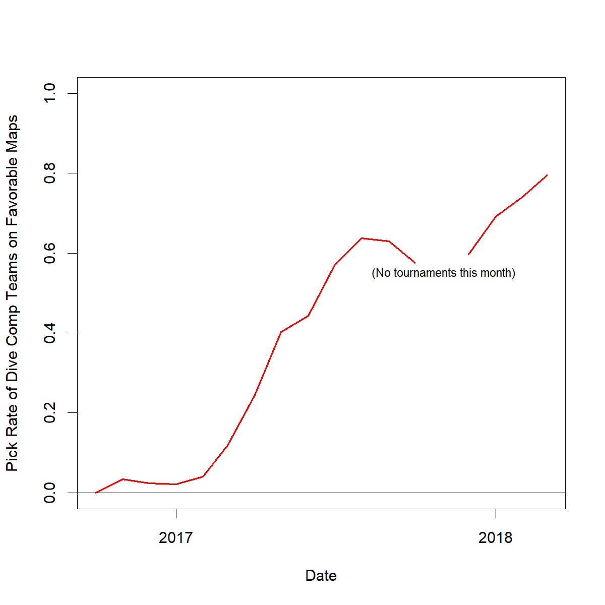 In the months leading up to and following the launch of the Overwatch League, dive comp’s climb has only continued. The graph below, based on detailed data provided by Winston’s Lab founder Dennis Matz, shows the rate at which dive-comp teams—those containing Winston, D.Va, Zenyatta, or Ana, and any two damage-per-second characters—have been selected in pro games over time on the maps where the strategy is most potent. (King’s Row, Nepal Sanctum, Lijiang Control Center, and Junkertown—four environments that are narrow enough to make flanking opponents difficult—are excluded from the sample.)