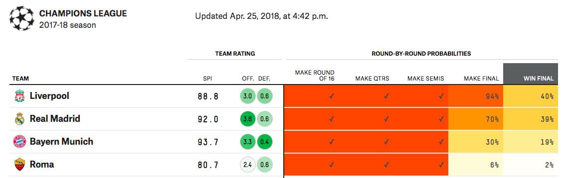 At least until next Tuesday, when one of the more-talented teams with better underlying numbers officially clinches a spot in the final, Liverpool are the favorites to win the Champions League.
