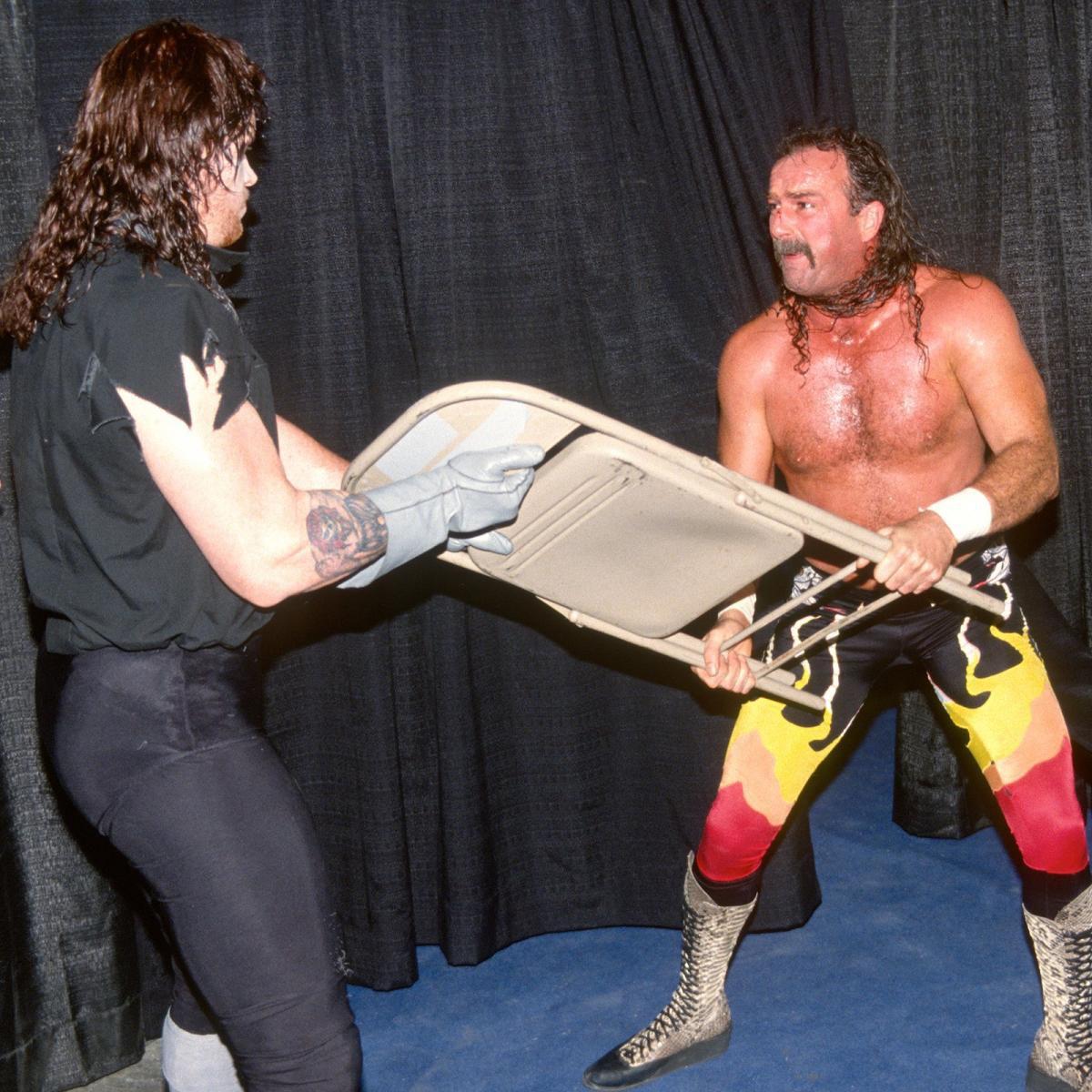 The character underwent more changes when Paul Bearer, a spooky mortician played by William Moody, replaced Brother Love, and the Undertaker slowly transformed from heel to fan favorite. His first feud as a babyface was against Roberts with the culmination scheduled for WrestleMania VIII in April 1992. It did not go off as planned. “There were some things that happened during the match that I regret that I did,” says Roberts, who was leaving the company after WrestleMania. “I shorted Mark on some things and I shouldn’t have. I apologized ultimately for that.”
