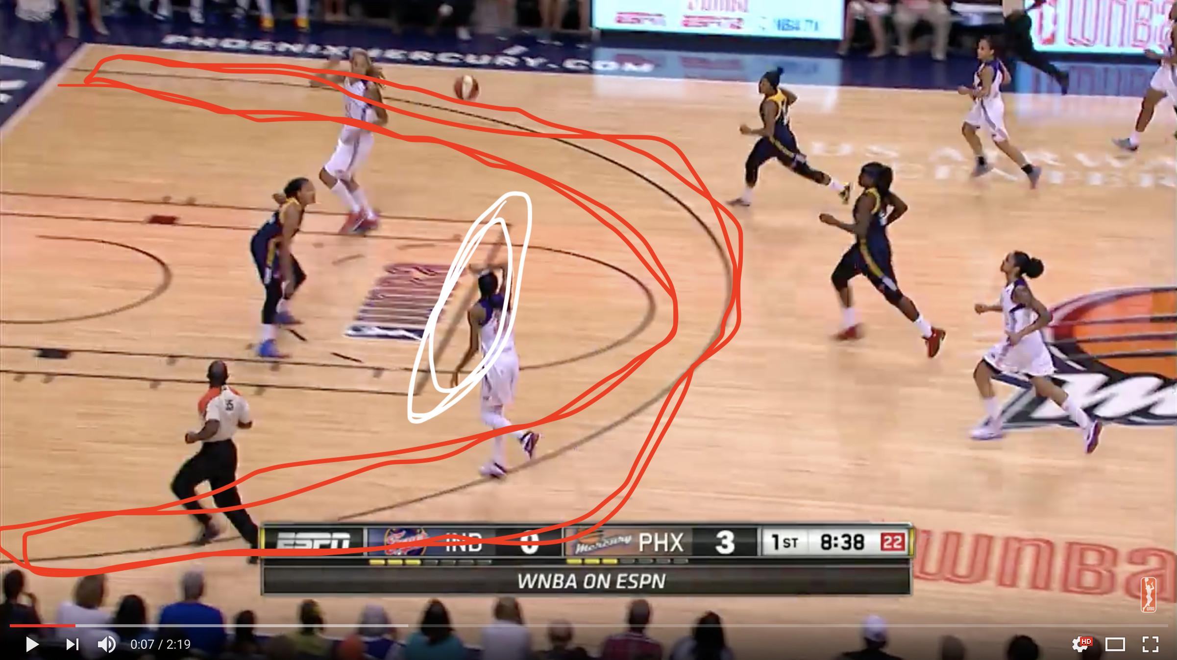 The line circled in white is the “free throw line.” That’s where a player stands and shoots from if (a) she is fouled while attempting a shot, or (b) the defending team has committed enough team fouls to put its opponent in “the bonus,” which means any player fouled gets to shoot free throws, regardless of whether the foul occurred during a shot attempt. (A “foul” is when one player makes contact with another player in any manner considered illegal.) Each made basket at the free throw line is worth one point. (Tianna Hawkins of the Mystics lead the league in free throw percentage last season. She shot 95.3 percent.)