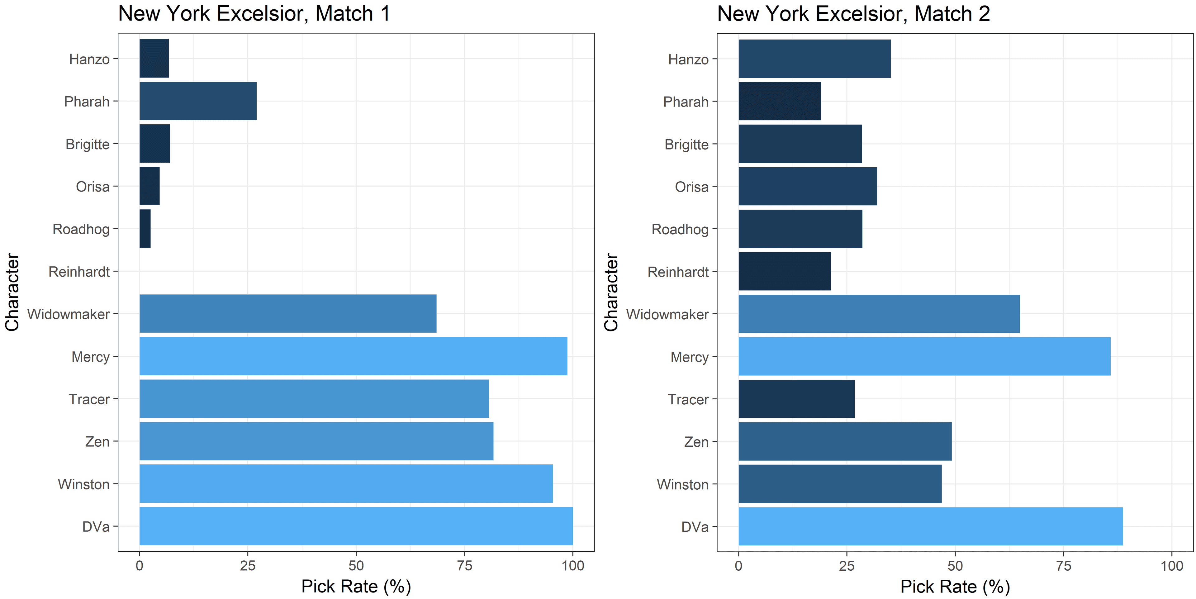 Although the Excelsior fared better in that second match, those adjustments were too little and too late. Judging by a post-match tweet from NYXL support player Yeon-jun “Ark” Hong, the new tactics may have left the players feeling unprepared. And even after their mid-playoffs adjustment, the Excelsior’s overall playoff hero selection was still out of step with the rest of the playoff field, as the following charts reveal.
