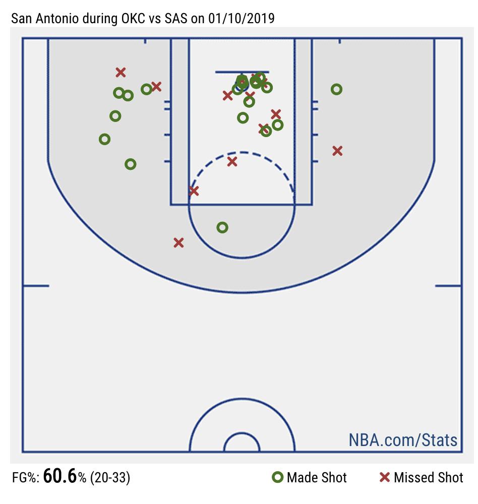 But the Spurs, as the Spurs do, have rallied back, and both Aldridge and DeRozan are leading the charge. As Kevin O’Connor wrote recently, San Antonio has developed a system that suits both its starters’ and their reserves’ strengths. Aldridge and DeRozan are exploiting the midrange, while the rest of the roster takes and make 3s. The game against the Thunder was the epitome of this strategy. The Spurs’ starters took six 3s and made four of them. Their bench took 13 and made 12 of them.