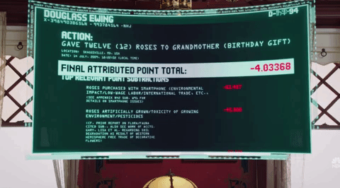 It’s hard to argue with the ethical dilemmas this process breaks down—workers shouldn’t be overworked and underpaid, toxic pesticides are indeed bad for the environment, and humans should do more to reduce our carbon footprint—but that means any kind gesture can have myriad negative effects most people aren’t even capable of thinking about. Maybe, The Good Place posits through this depressing exercise, the way humans live in the present is uniquely designed to make us all terrible people.