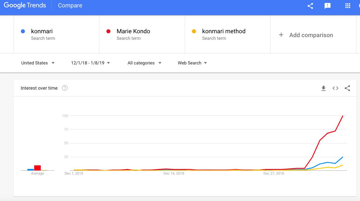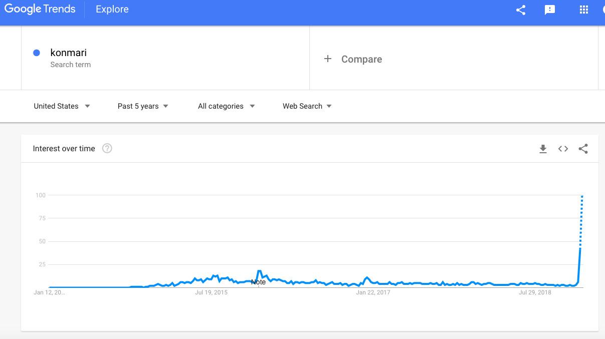 According to Google Trends, the search terms “konmari method,” “Marie Kondo,” and “konmari” spiked January 1, when the Netflix show launched. Compare that data with the release of Kondo’s book in 2014, when those same search terms took off and then more or less leveled off. This year the new numbers completely obliterated the original stats. The chart’s line is shooting nearly straight upward.