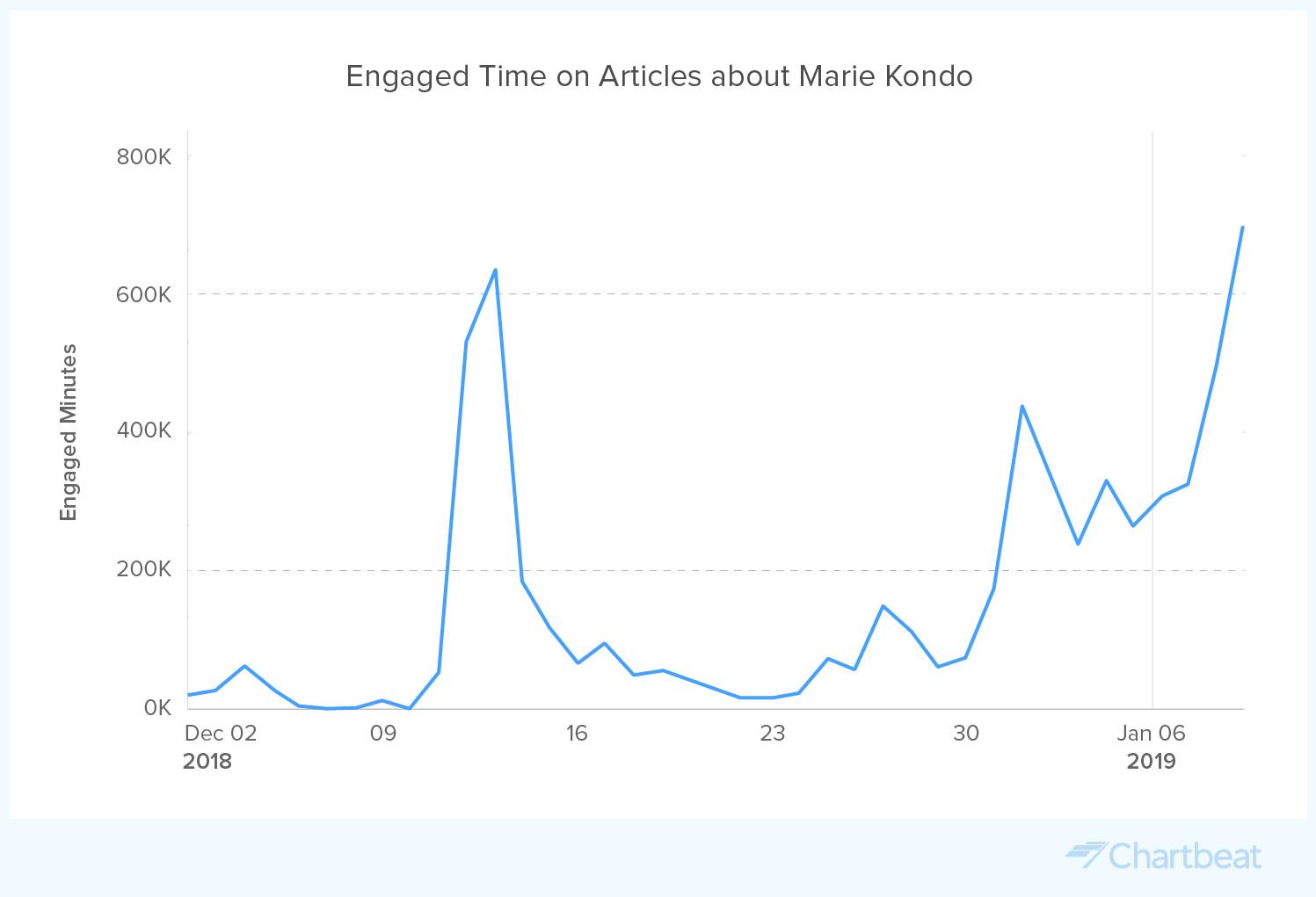 But Google Trends provides only one data point. Analytics company Chartbeat tracks engagement. Instead of compiling data for web searches, it calculates page views and time spent on a given topic. According to Chartbeat’s data, there was a major spark in interest around Marie Kondo on December 12 and 13, when the official Netflix trailer was released. Chartbeat’s analytics said that readers spent 536,215 minutes reading articles about Marie Kondo on December 12 and another 634,405 minutes doing the same the following day. Compare that with the 57,432 “engaged minutes” the same topic inspired December 11.
