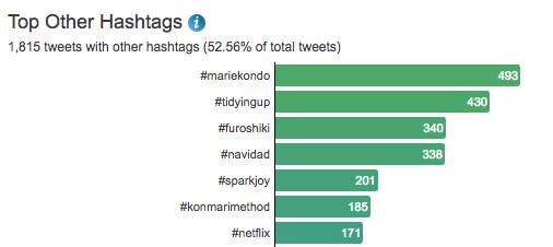 The KonMari resurgence also inspired a proliferation of related social media hashtags. Analytics firm Hashtracking reveals that tweets with the hashtag #konmari began steadily climbing at the time of the show’s release and then jumped immediately. Some of Hashtracking’s data suggests that the show is very popular with Spanish speakers; one of the most popular hashtags included in the #konmari tweets was #navidad. (Other popular hashtags accompanying it were terms like #tidyingup, #mariekondo, and #sparkjoy.)