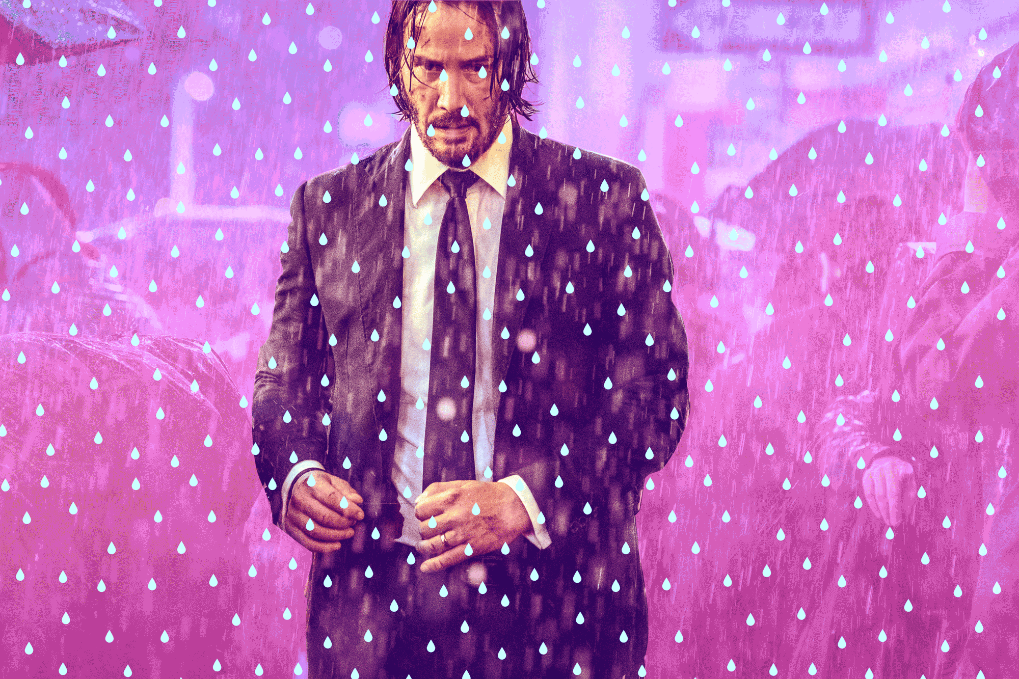 You know something dank is about to go down when moody rain is pouring down on the Lionsgate logo. This really sets the tone for John Wick, man and character, since it’s the Baba Yaga’s forever mood. Remember: This franchise began with John’s wife dying—the funeral happened during a torrential downpour—followed by the death of the puppy his wife gifted him. John (we’re on a first-name basis) also wears black suits all the time, and they always look good—even when they got soggy in a storm.