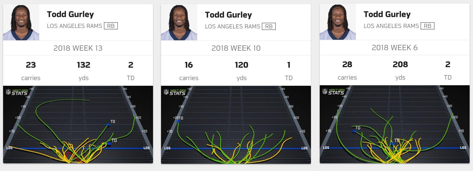 Put it all together, and Anderson has amassed 422 rushing yards on 66 carries with the Rams, good for a 6.4-yards-per-tote average. Some of that success, of course, is due to the Rams’ supremely talented offensive line—the unit ranks no. 1 in Football Outsiders’ adjusted line yards and no. 1 in Pro Football Focus’s run-blocking grade—and Sean McVay’s scheme, which is known for creating light boxes for his running backs. But even after recognizing that Anderson has benefited from an essentially perfect situation, we have to acknowledge how wild his production has been. Per Sharp Football Stats, Anderson has been successful on 74.2 percent of his rushing attempts with the Rams, an inevitably unsustainable number that dwarves both Gurley’s figure (57.0 percent) and the NFL average (47.5 percent).