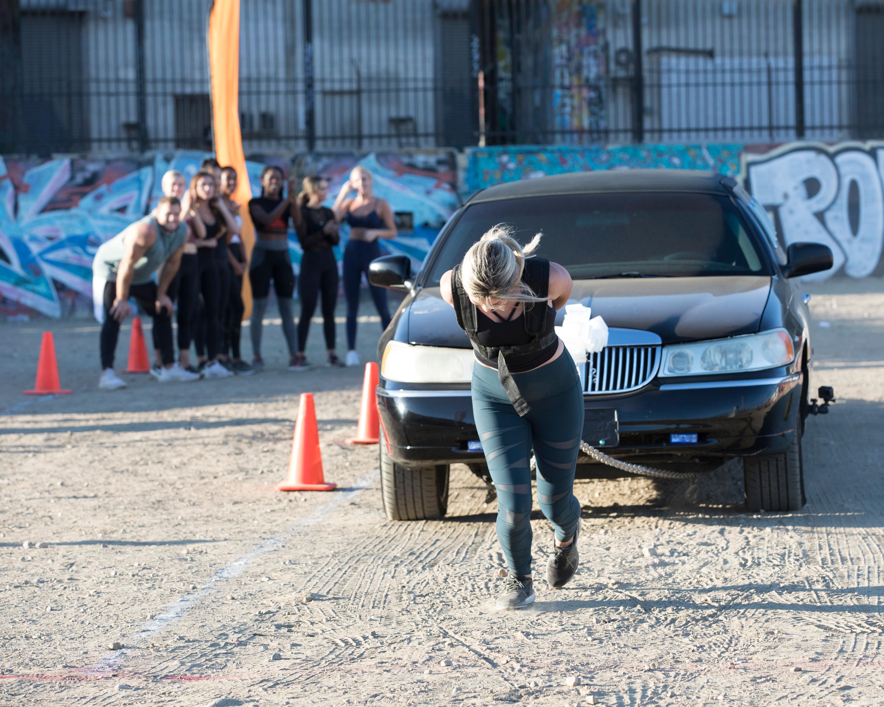 Afterward, the group is subjected to a series of performative strength tests, one of which is pulling a limousine. It’s established that none of the women could possibly move a limousine—and then Caitlin just steps up and bodies the multi-ton car with ease: