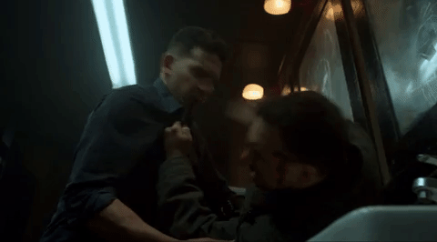Considering where we left off last season—Frank found out his military bestie Billy Russo (Ben Barnes) was involved in his family’s murder, prompting him to rack up a staggering body count in revenge—this is the closest the show could get to a happy ending (I swear, no pun intended). Of course, because this is The Punisher, the tranquility is short-lived. Returning to the bar for a second night, Frank sees a shifty teenage girl being stalked and then ambushed by a handful of strangers. Frank intervenes before she’s killed; among the well-choreographed carnage, this happens: