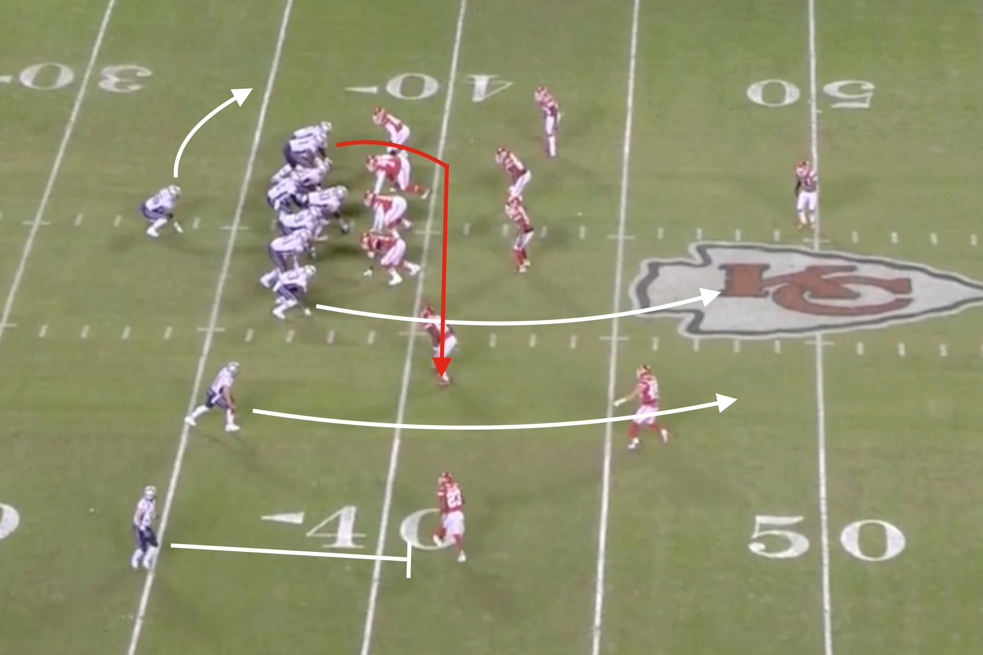 New England stressed the K.C. defense both vertically and horizontally—methodically picking it apart by scheming its role players open. They got this easy first down with a quick pass to Develin, who leaked out of the backfield to, again, exploit Ragland’s lack of sideline-to-sideline speed from the middle: