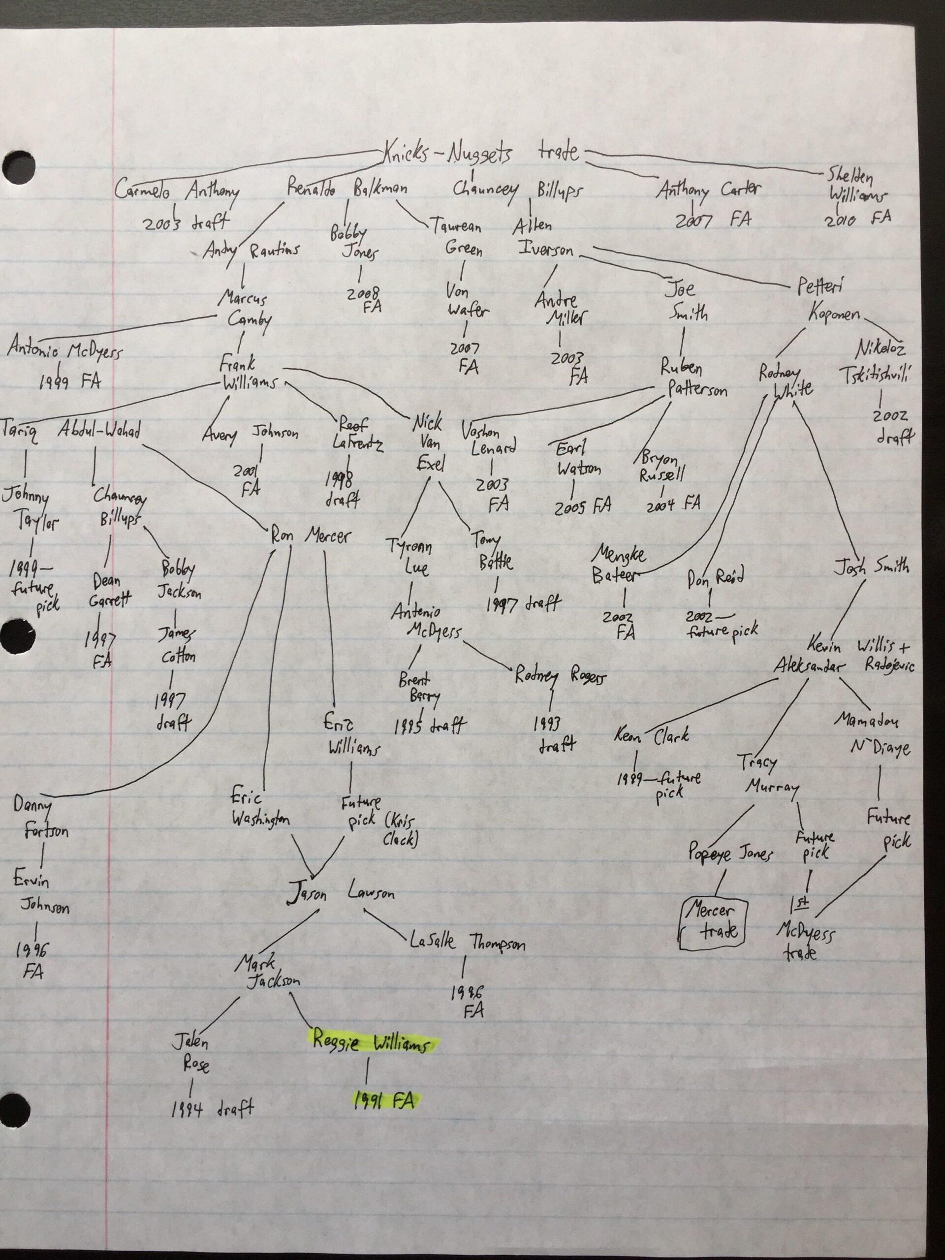 Until it reaches the trade that sent Carmelo Anthony and Chauncey Billups to New York, the Nuggets’ longest tree has too many branches and sub-branches and loops to properly include them all. We’ll choose just the longest to display here: