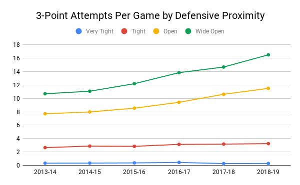 Teams aren’t just shooting more 3s—they’re specifically shooting more open 3s. NBA.com/Stats splits shot attempts into four categories based on the proximity of the closest defender, and all the new 3-pointers are coming in the “open” (with the closest defender between 4 and 6 feet away) and “wide open” (6 or more feet away) categories.