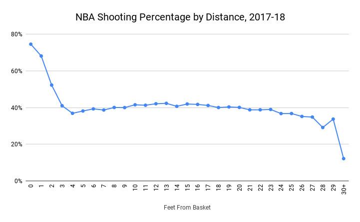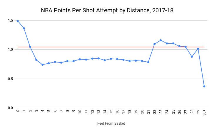 The red line represents the expected point value across every attempt in the league last season. The value of any given shot plummeted beyond 3 feet, but it perked back up at the 3-point line. Shots from 23 feet away were actually more valuable than shots from just 2 feet away; shots from the midrange look even less appealing when compared to shots from just a few steps farther back. (That analysis doesn’t account for free throws and the potential for offensive rebounds and turnovers, but the general pattern remains the same.)