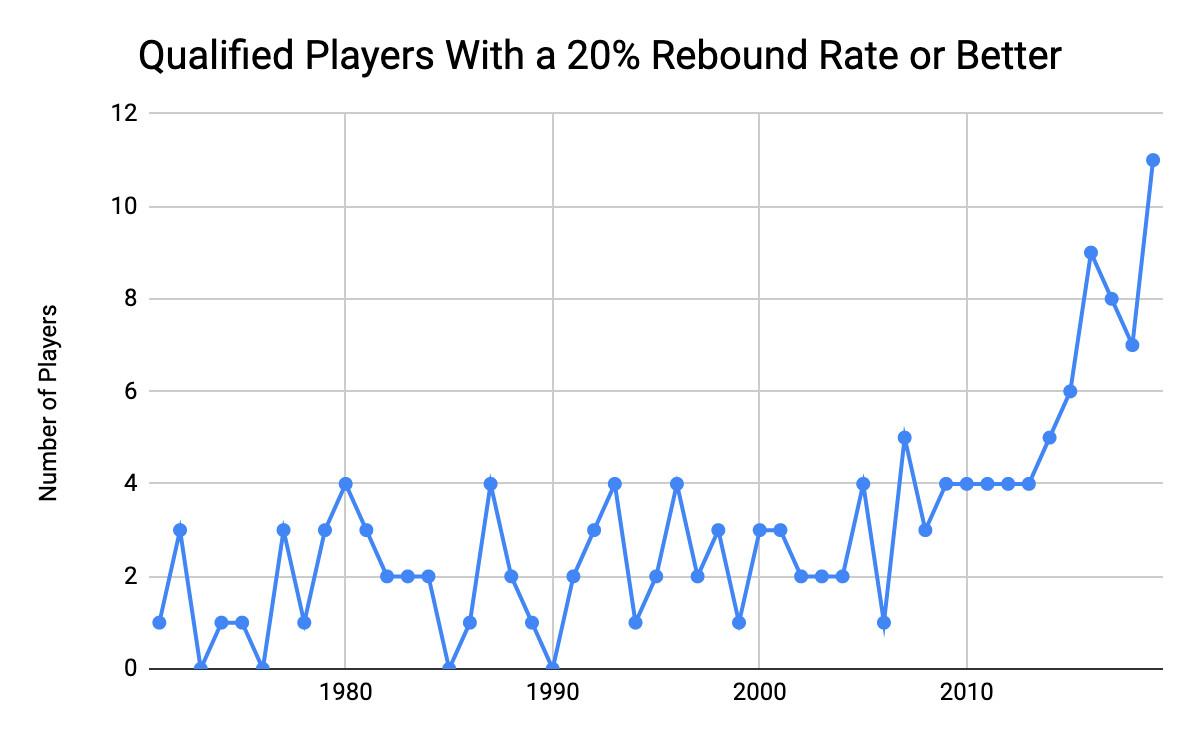 The irony of Wilt’s rebounding records is that more of today’s centers are collecting a higher percentage of rebounds than ever before. The five seasons with the most qualifying players with a rebounding percentage of 20 or better are the five most recent seasons, as many traditionally sized rebounders leave the court (or spread out on it) and yield more space for the few remaining close-to-the-basket bigs.