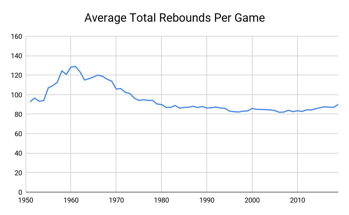 The difference in shooting percentage between 1961 and 2019 would lead to about 8-10 extra rebounds per night in a single game, even before accounting for the former season’s heightened pace. Accounting for pace yields a massive difference—about an extra 40 rebounds every game for teams in the 1960s to chase.