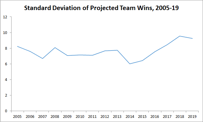 The first thing to note is that MLB’s ongoing superteam era has led to more scattered preseason projections. The standard deviation of projected team wins—a measure of how closely the projected team totals have clustered around the mean—has been higher in each season from 2017 to 2019 than it was in any previous season in the sample. In other words, there’s less proximity between the projected team totals, with a wider separation between the presumptive playoff teams and the probable laggards.