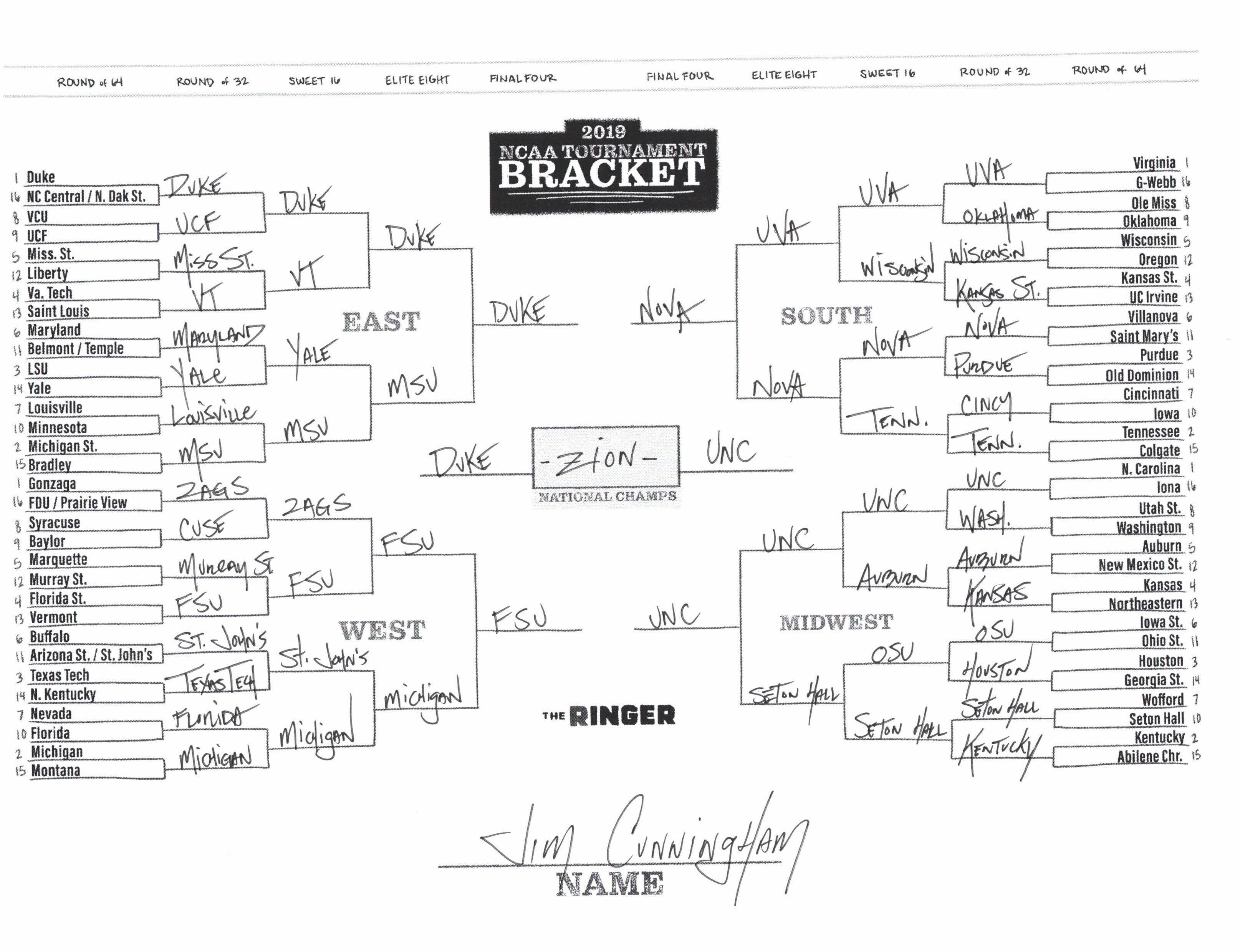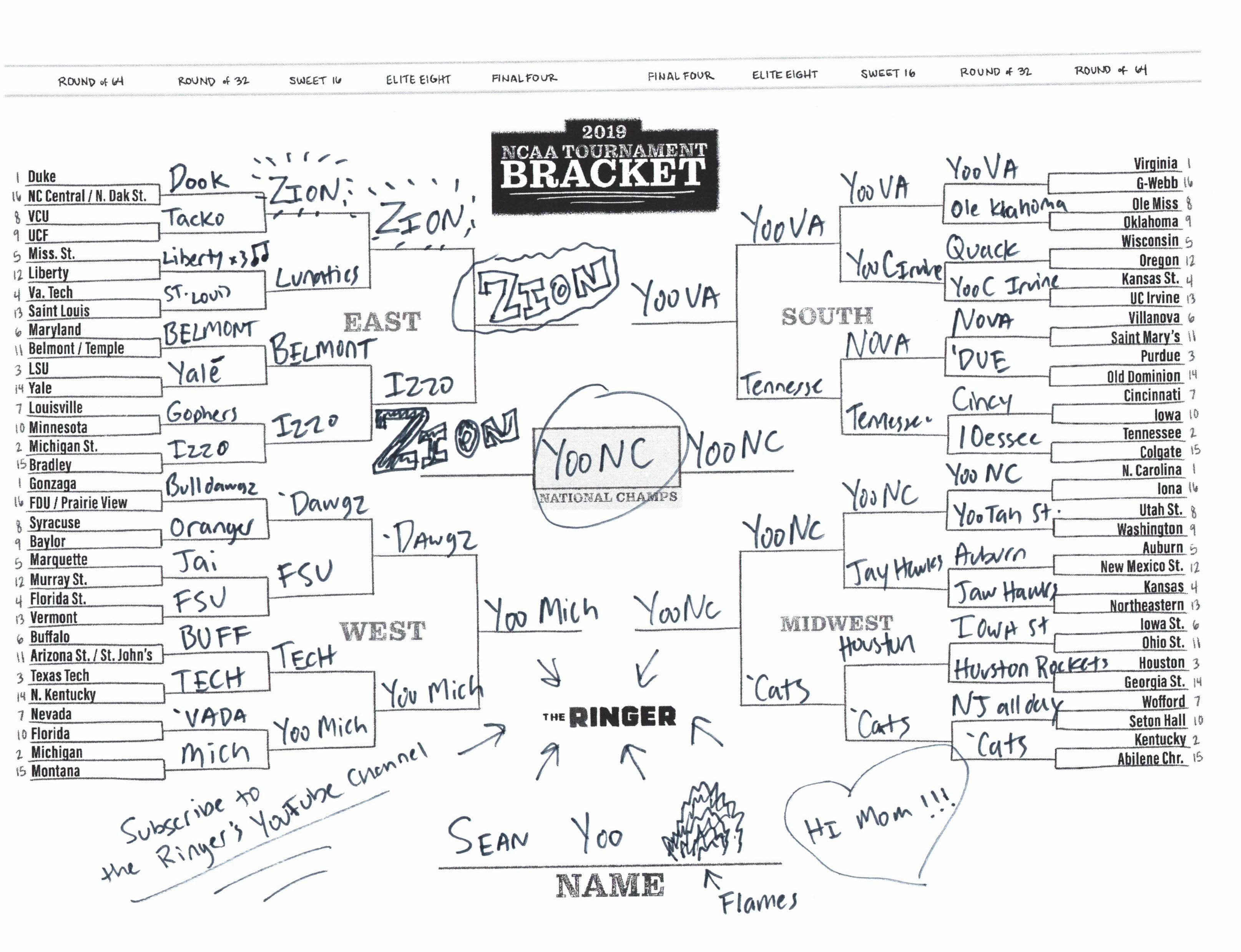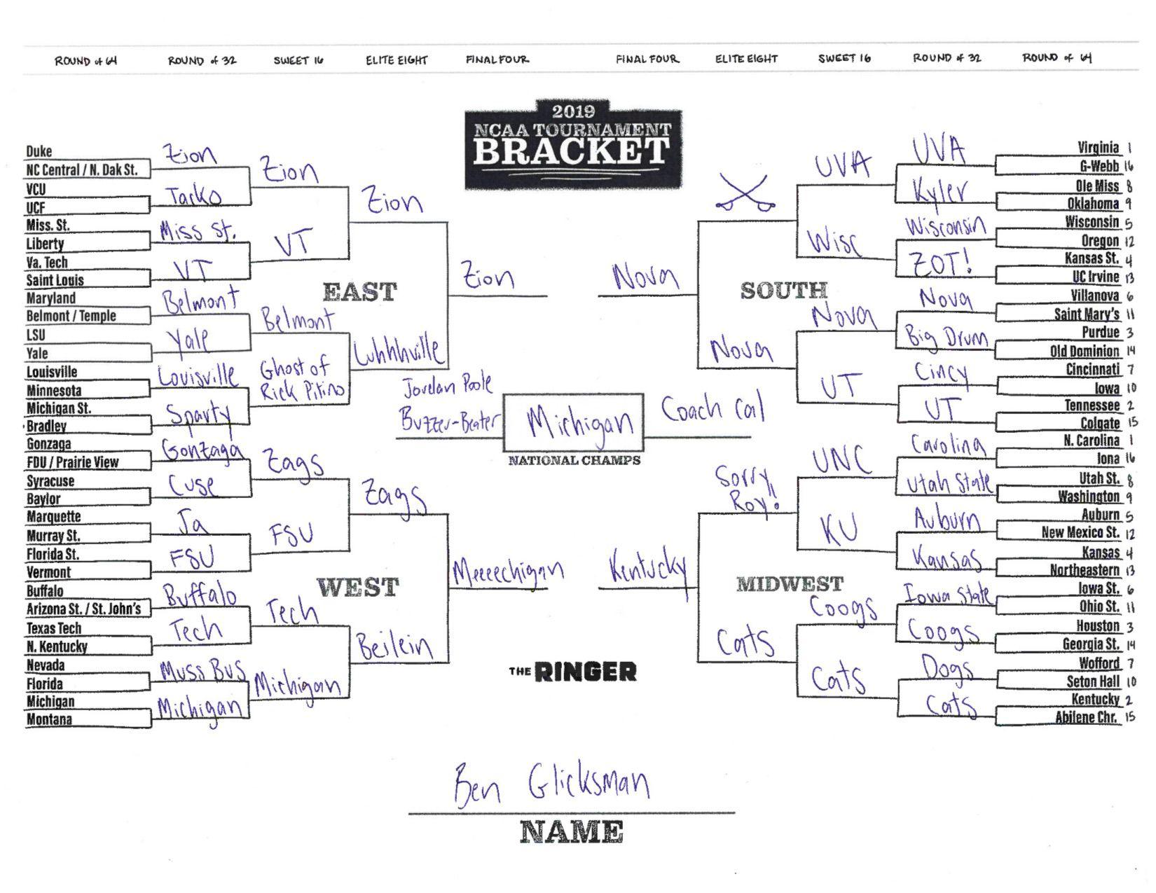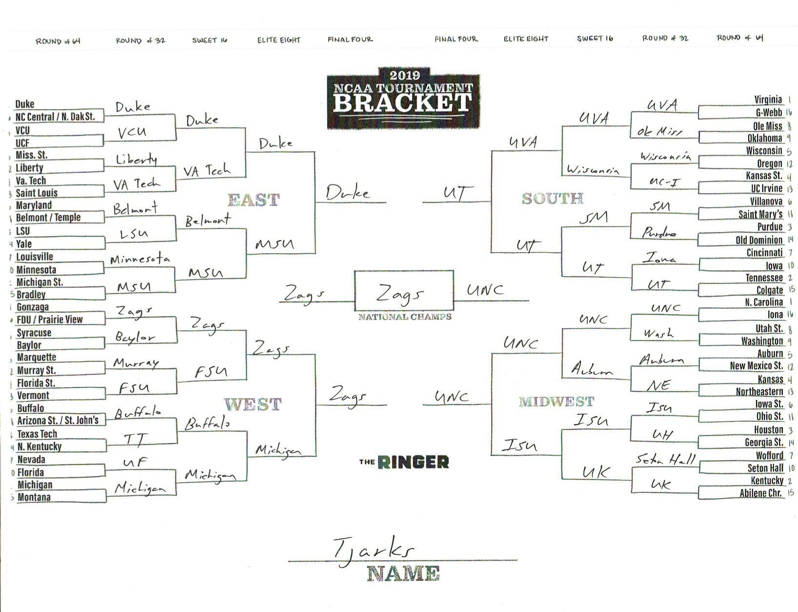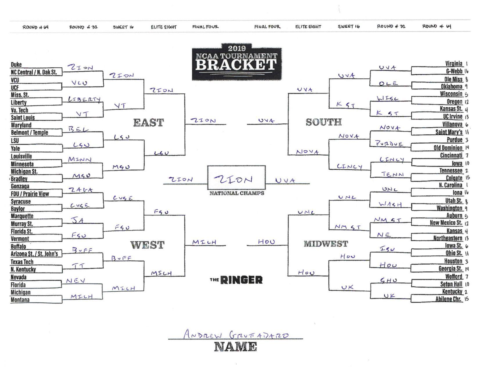 The 2019 NCAA tournament is here, and that means it’s time to talk about Zion, office pools, Zion, Cinderellas, and Zion. It also means that it’s time for Ringer staffers to publish their sure-to-be-accurate March Madness picks. Some of the brackets below were filled out by people who know the correct way to spell Mike Krzyzewski. Others were filled out by people who believe that Ja Morant was a contestant on The Masked Singer. All are guaranteed to be right.