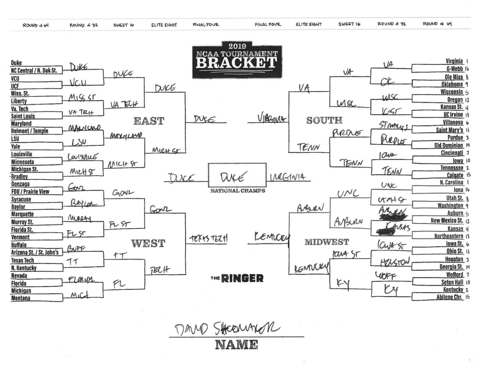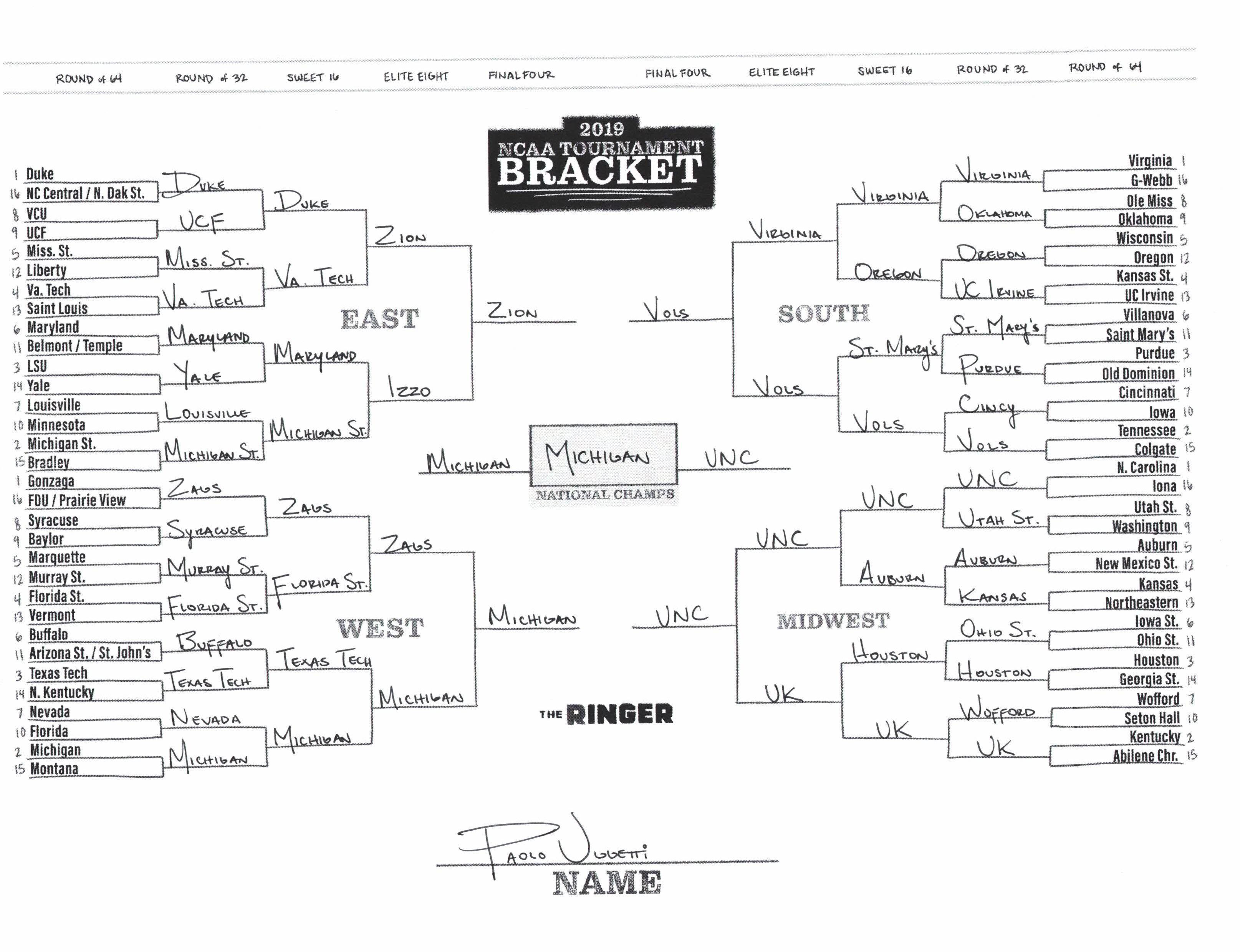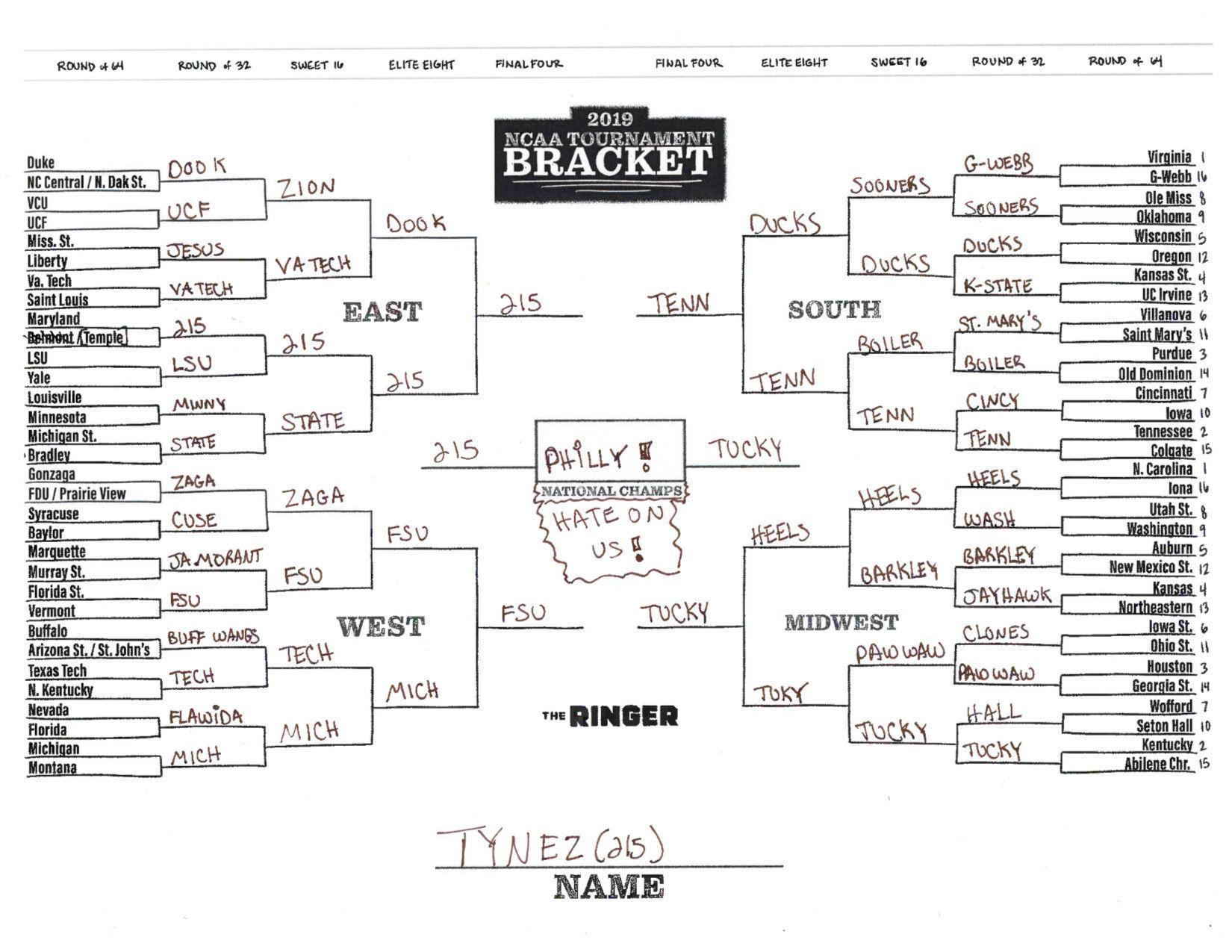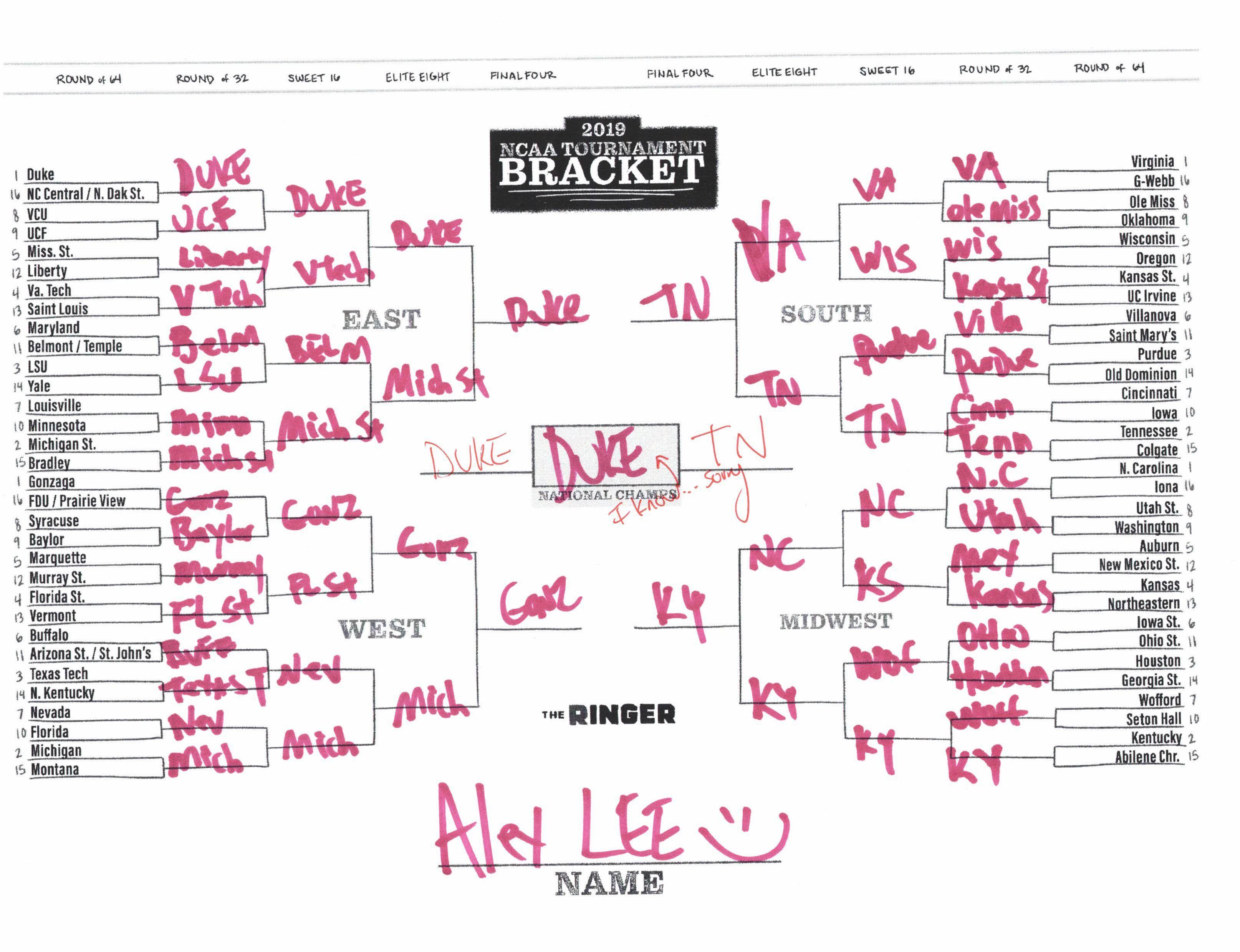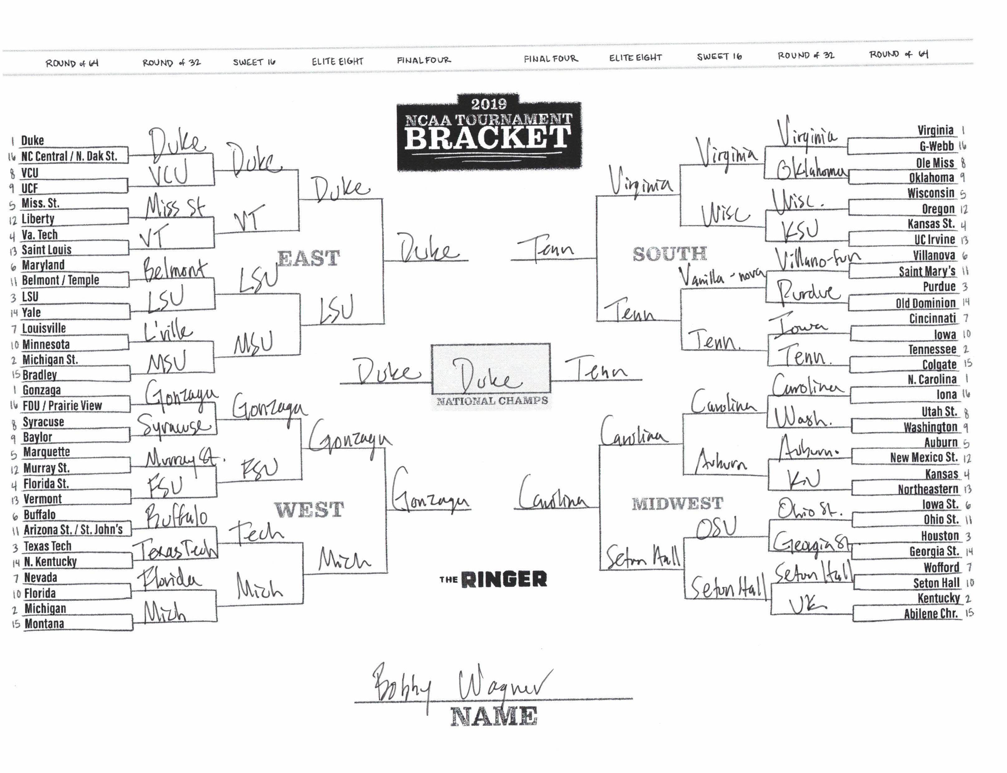 The 2019 NCAA tournament is here, and that means it’s time to talk about Zion, office pools, Zion, Cinderellas, and Zion. It also means that it’s time for Ringer staffers to publish their sure-to-be-accurate March Madness picks. Some of the brackets below were filled out by people who know the correct way to spell Mike Krzyzewski. Others were filled out by people who believe that Ja Morant was a contestant on The Masked Singer. All are guaranteed to be right.