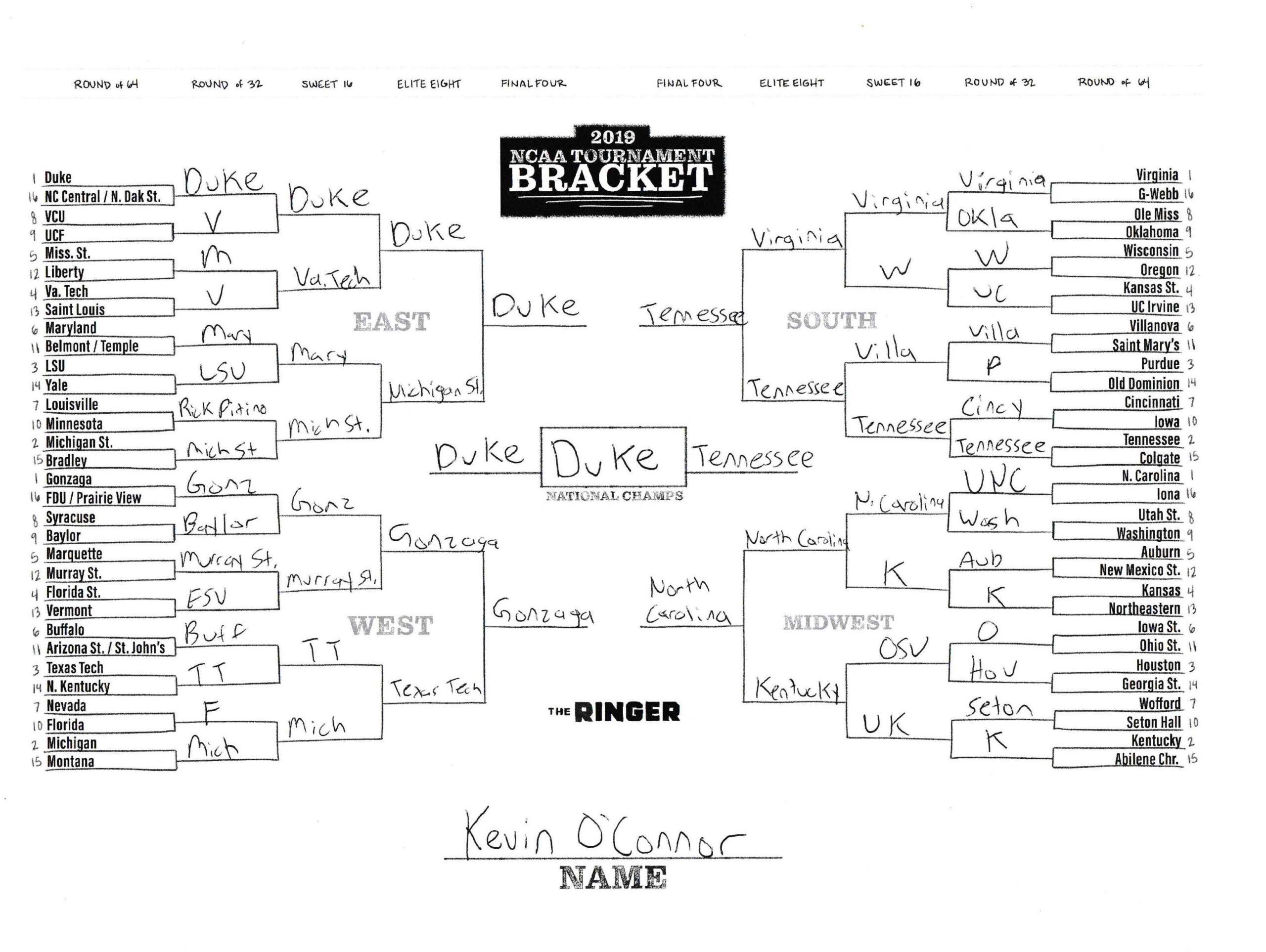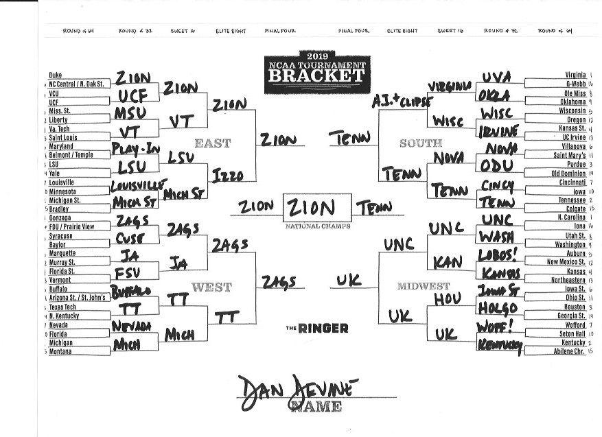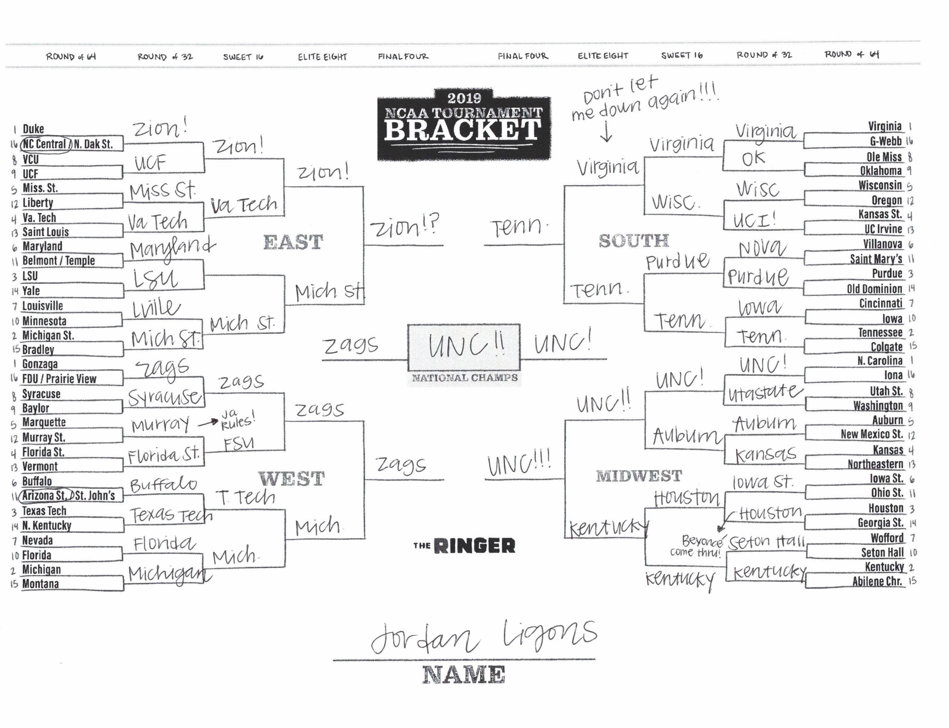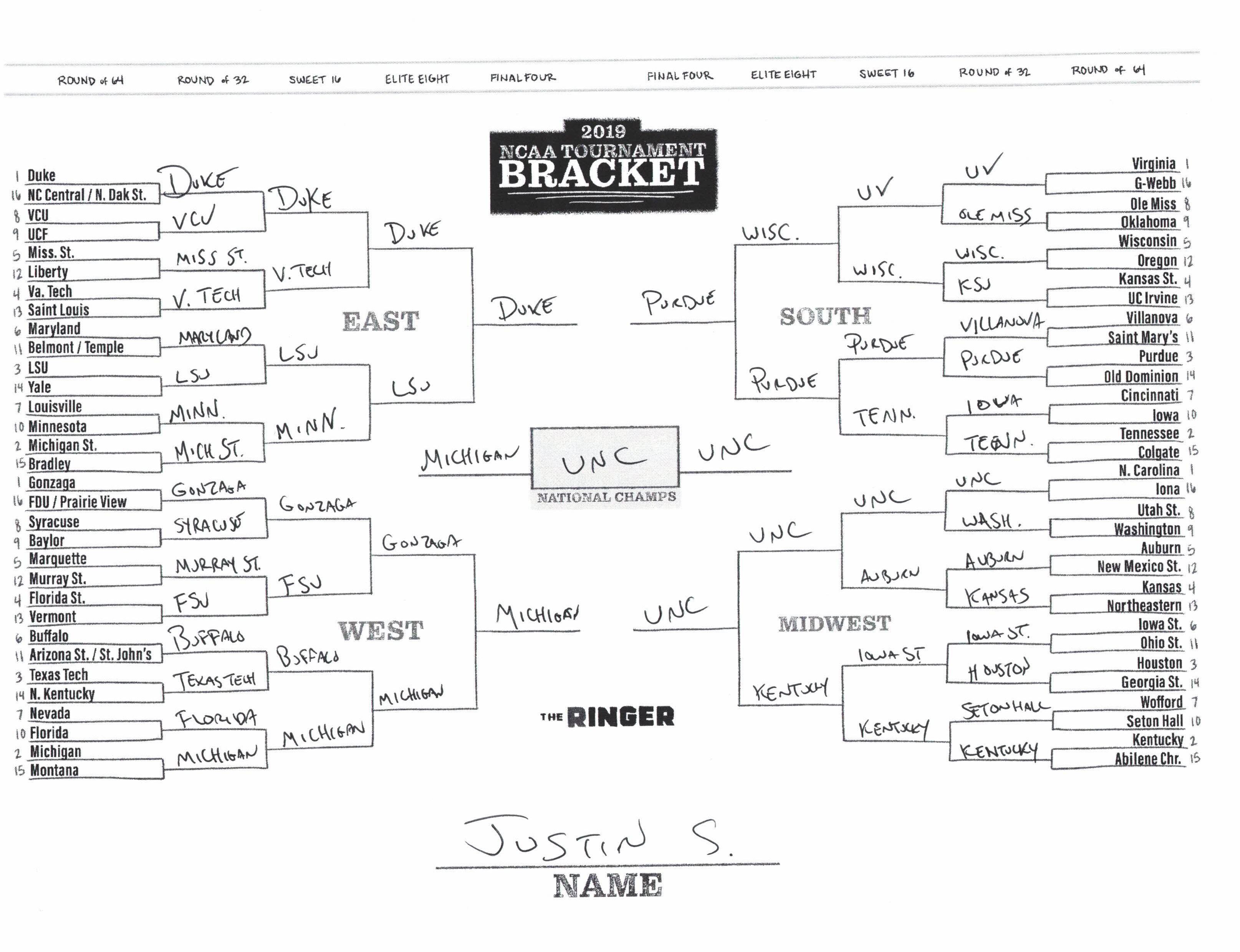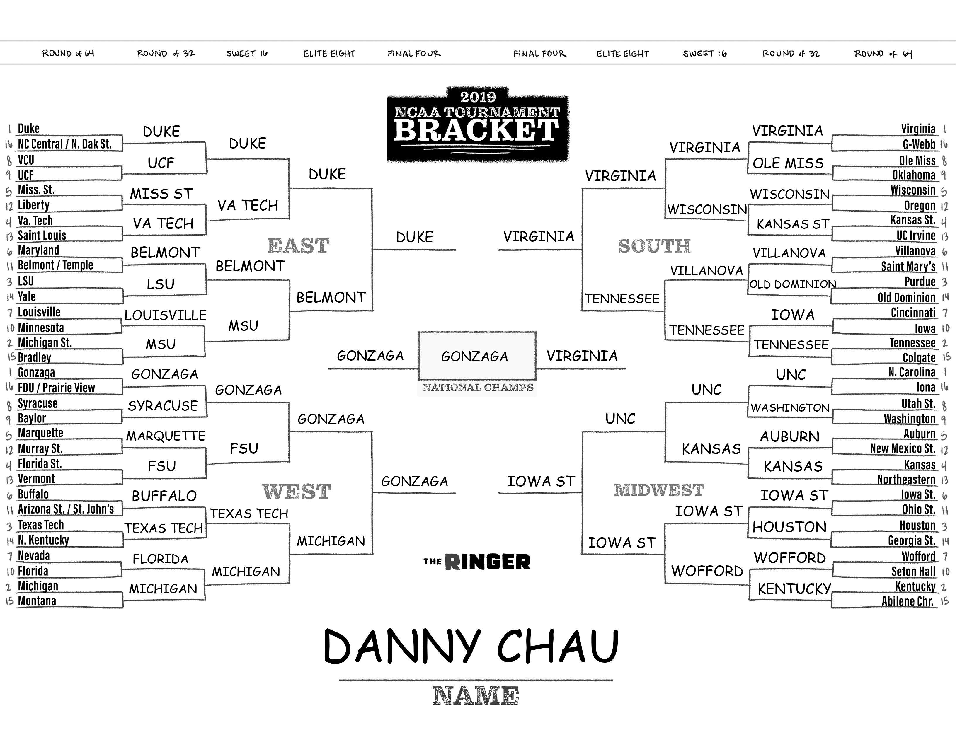 The 2019 NCAA tournament is here, and that means it’s time to talk about Zion, office pools, Zion, Cinderellas, and Zion. It also means that it’s time for Ringer staffers to publish their sure-to-be-accurate March Madness picks. Some of the brackets below were filled out by people who know the correct way to spell Mike Krzyzewski. Others were filled out by people who believe that Ja Morant was a contestant on The Masked Singer. All are guaranteed to be right.