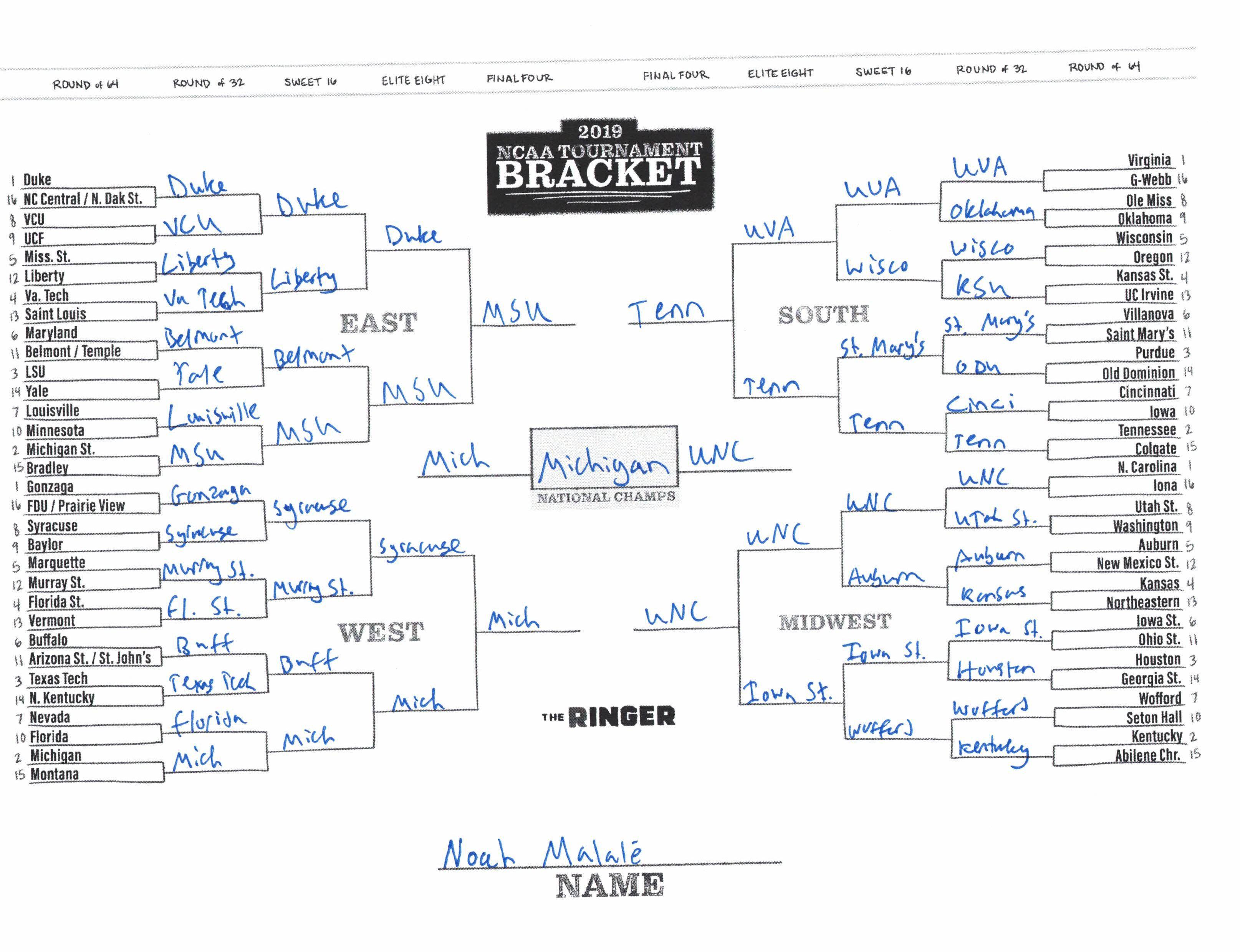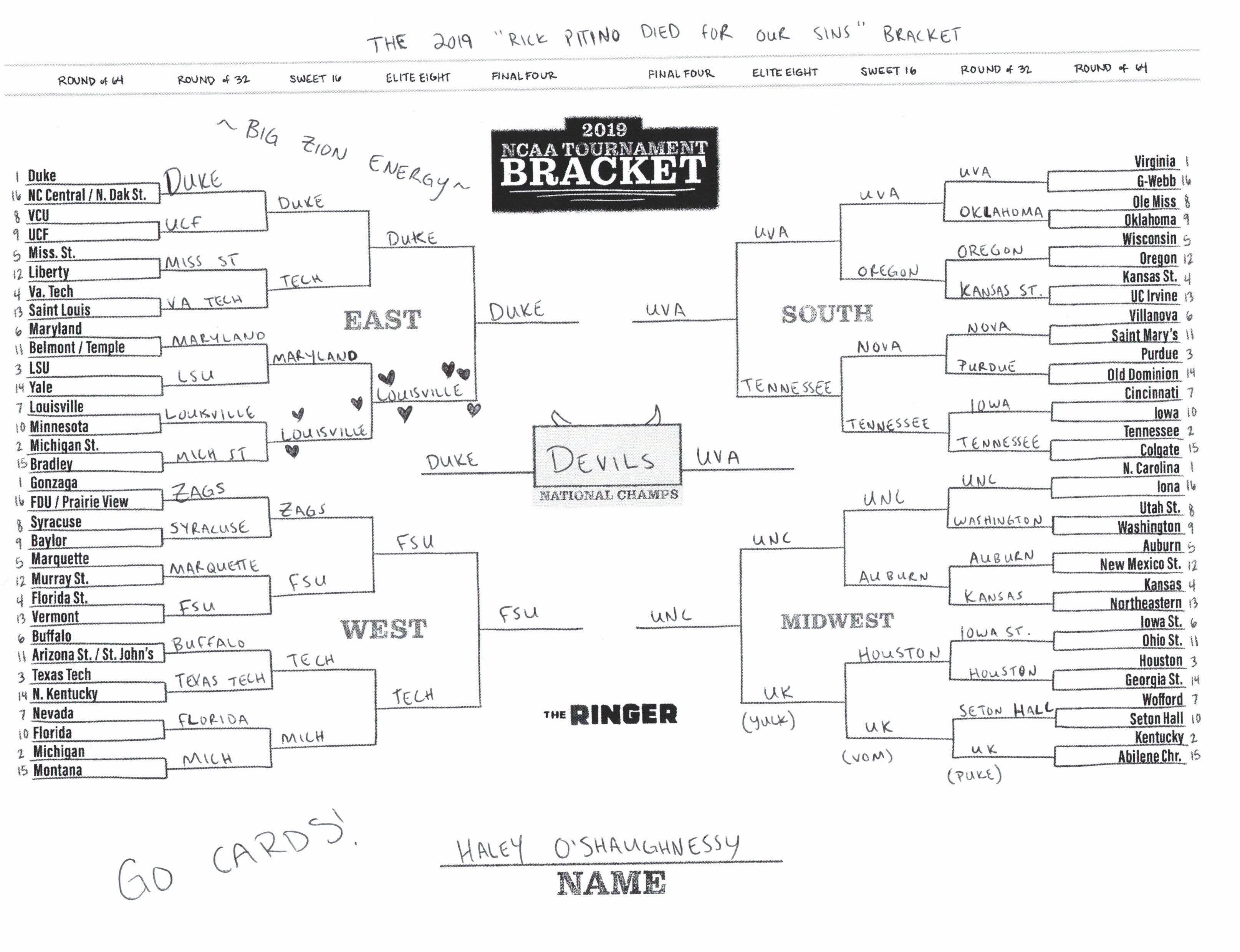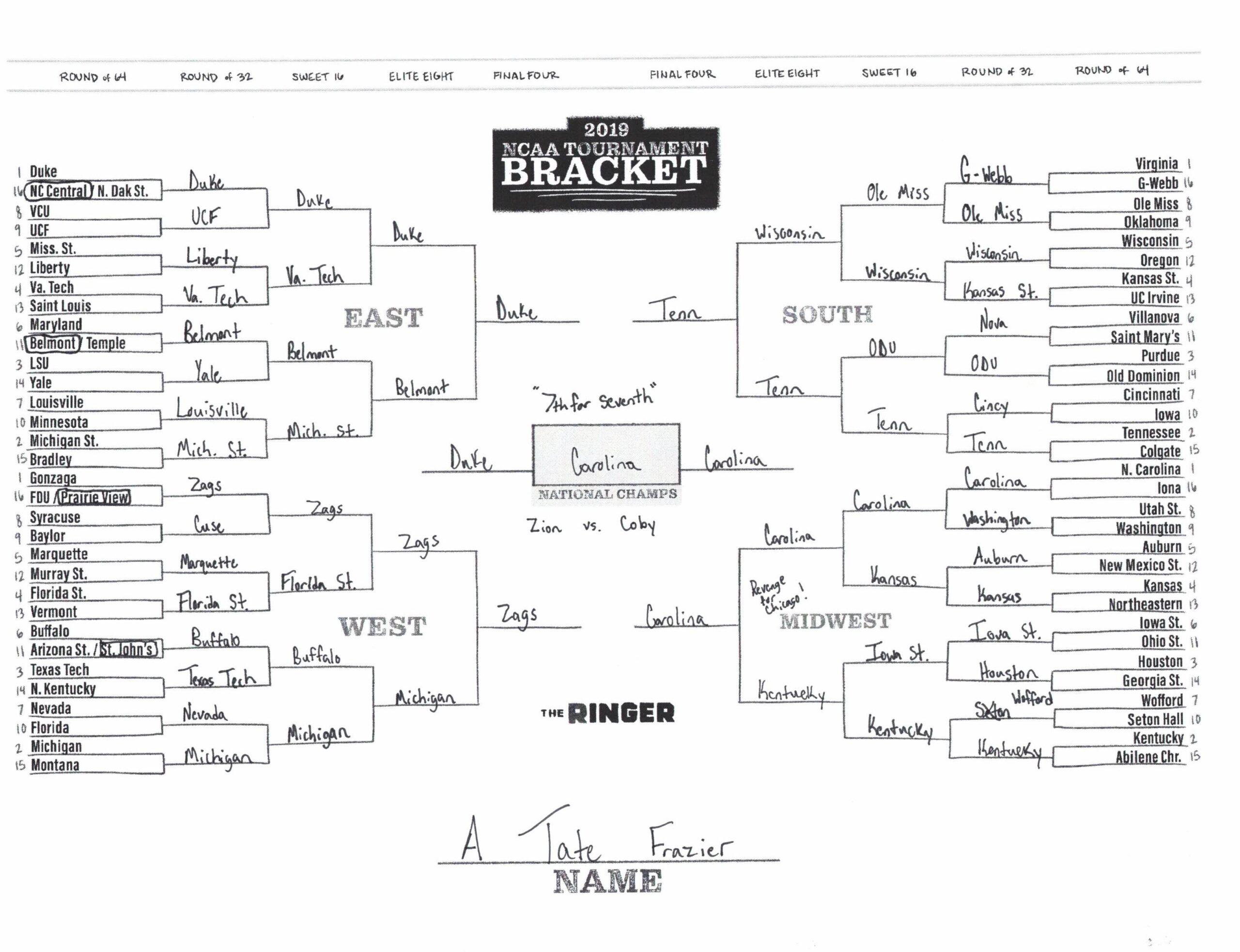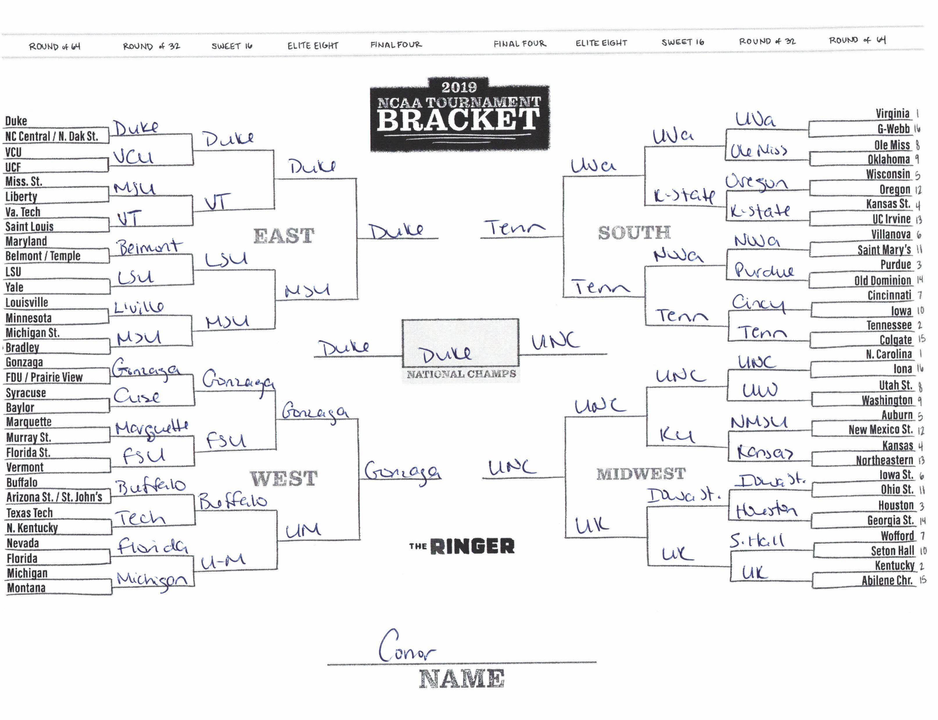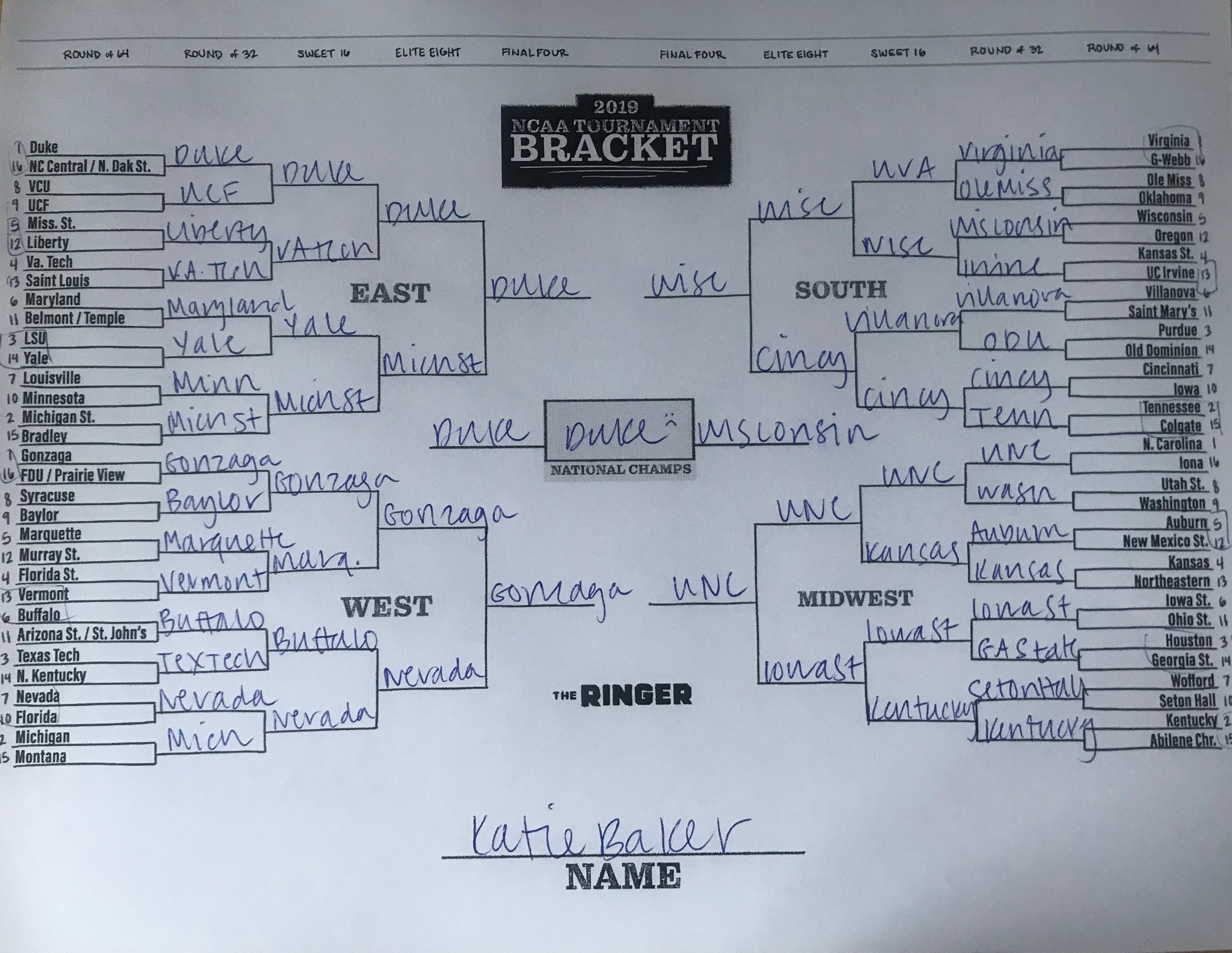 The 2019 NCAA tournament is here, and that means it’s time to talk about Zion, office pools, Zion, Cinderellas, and Zion. It also means that it’s time for Ringer staffers to publish their sure-to-be-accurate March Madness picks. Some of the brackets below were filled out by people who know the correct way to spell Mike Krzyzewski. Others were filled out by people who believe that Ja Morant was a contestant on The Masked Singer. All are guaranteed to be right.